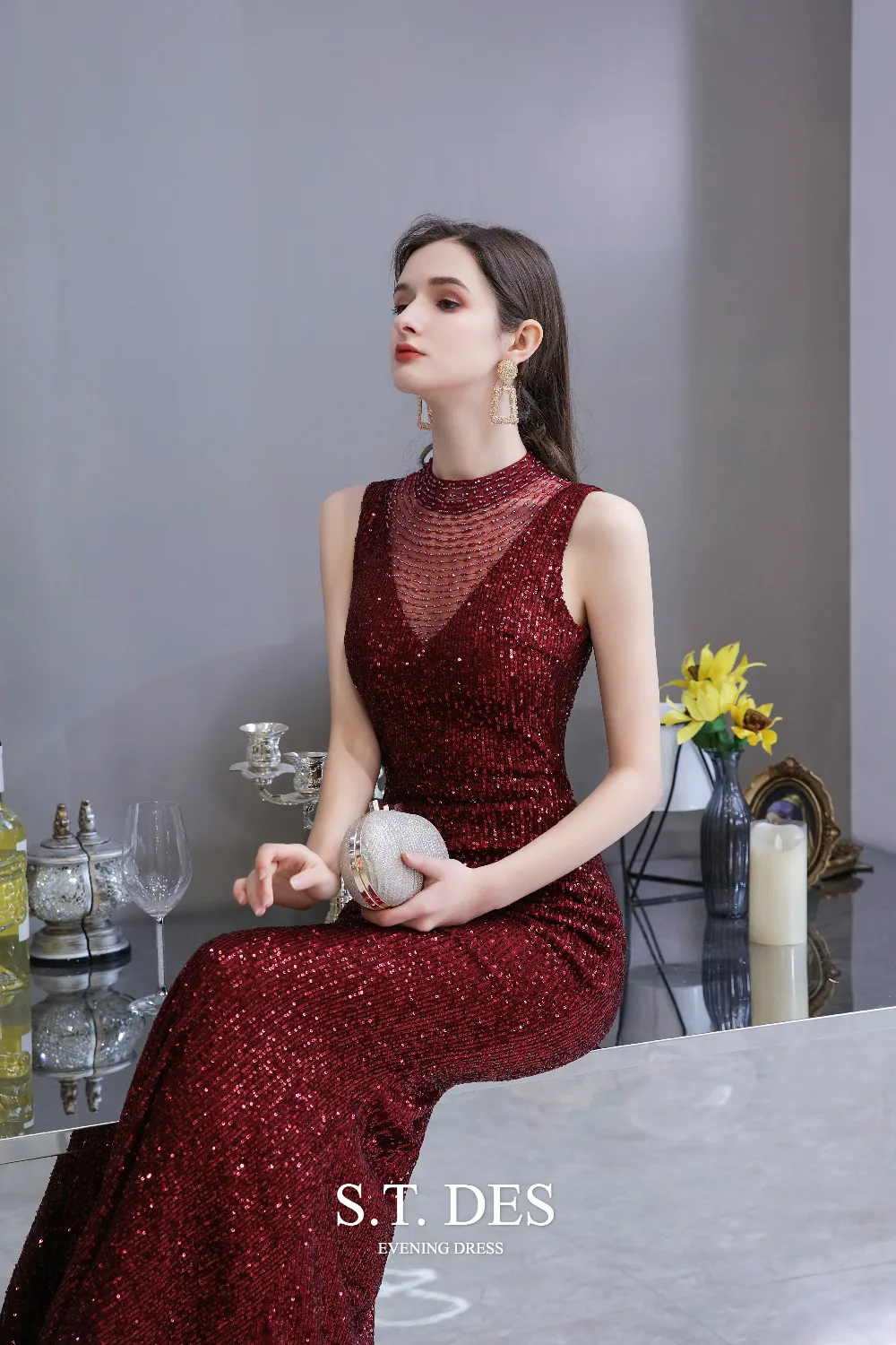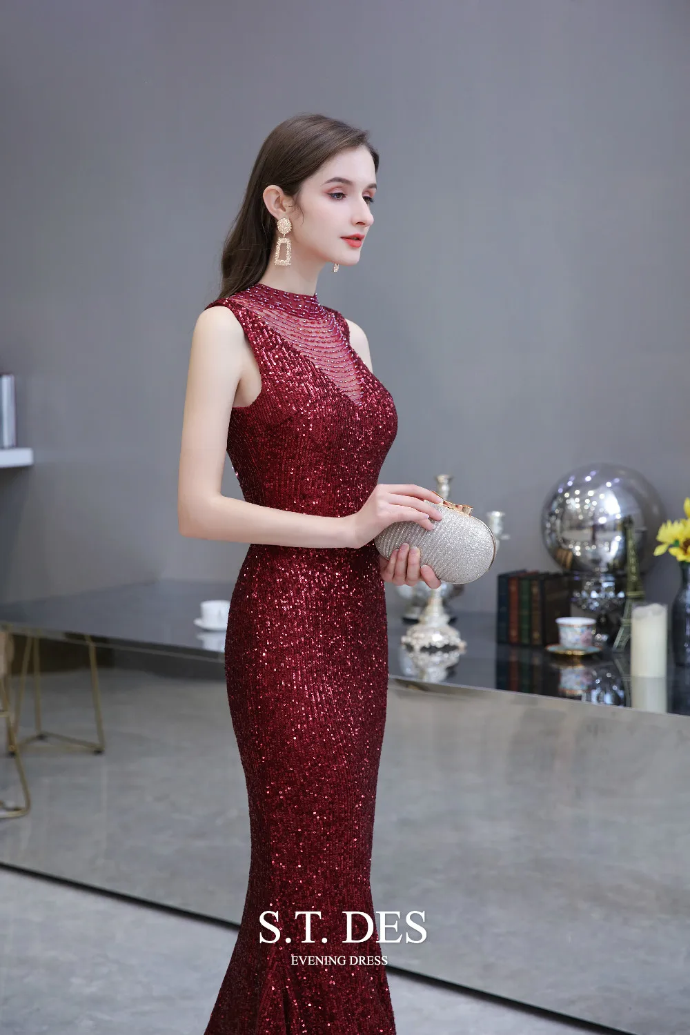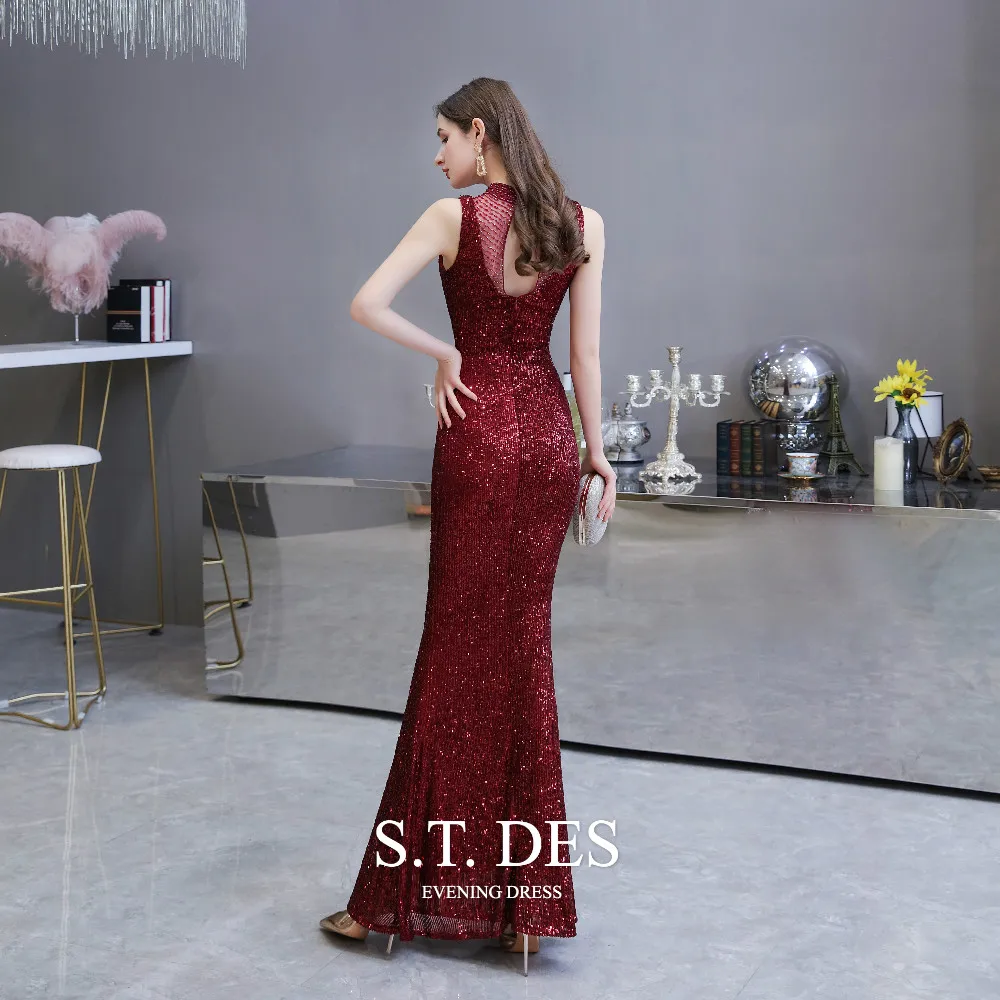 Formal-dress 2020 Summer S.T.DES Elegant Burgundy High Sheer Neck Full Sequins Tulle Illusion Mermaid Evening Dress For Woman