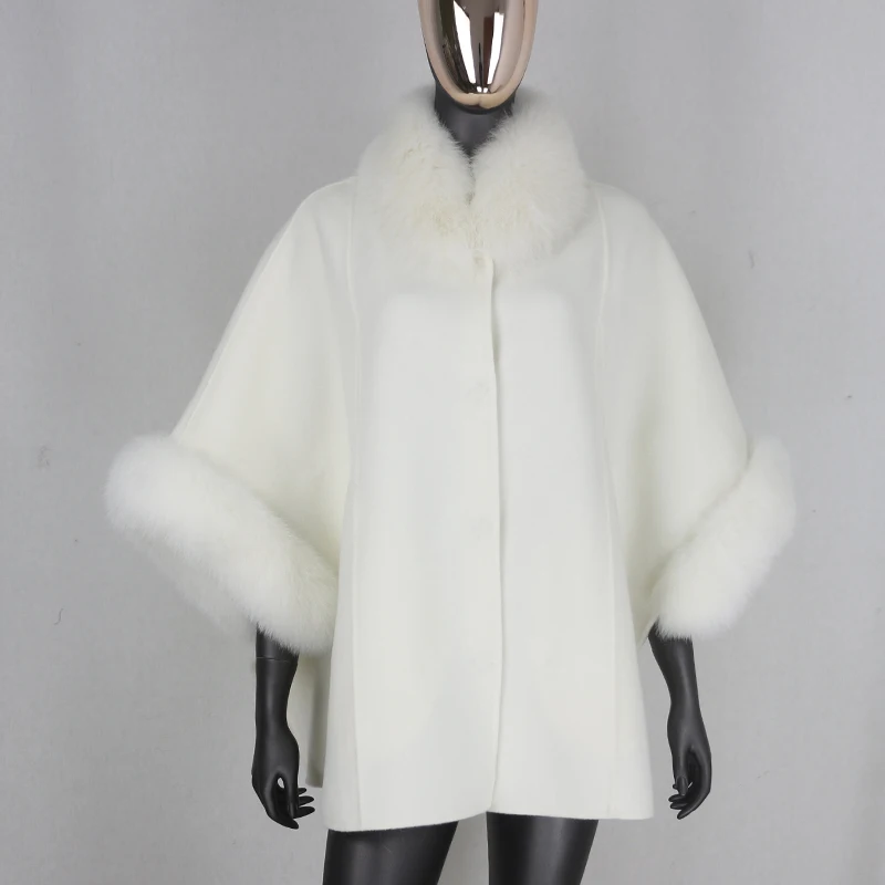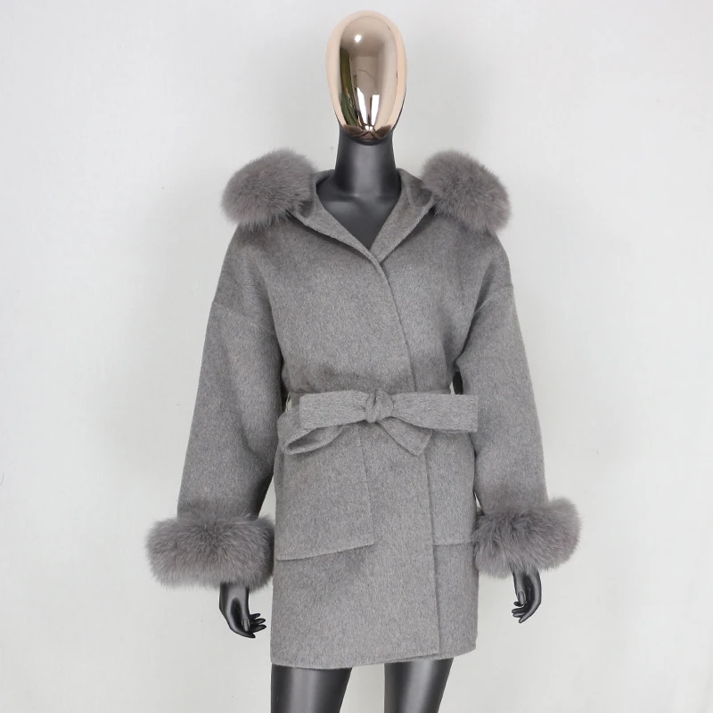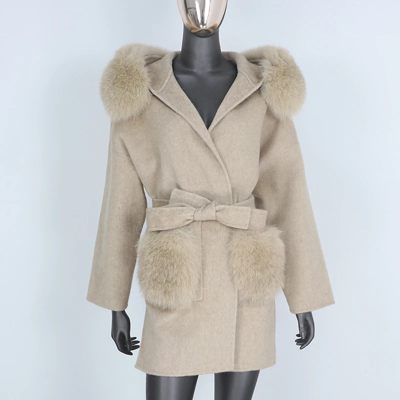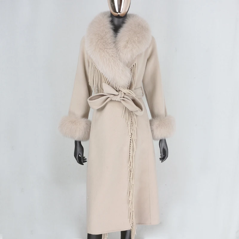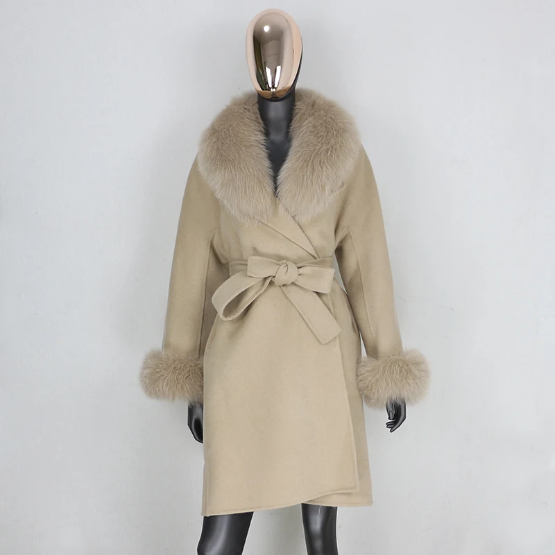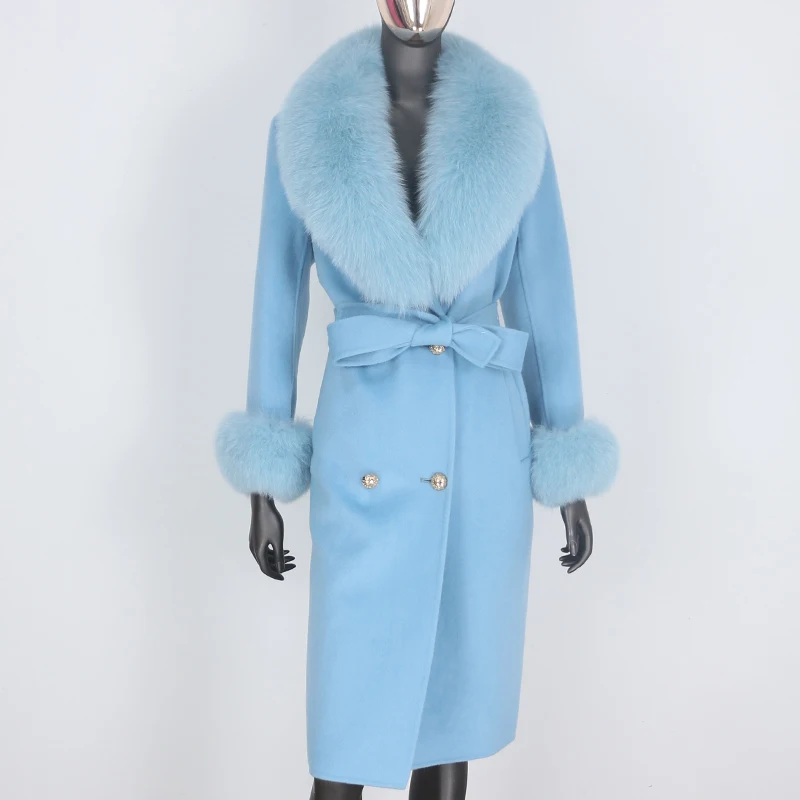 FURBELIEVE 2020 Real Fur Coat Winter Jacket Women 100% Natural Fox Fur Collar Cuffs Cashmere Wool Blends Oversize Outerwear New