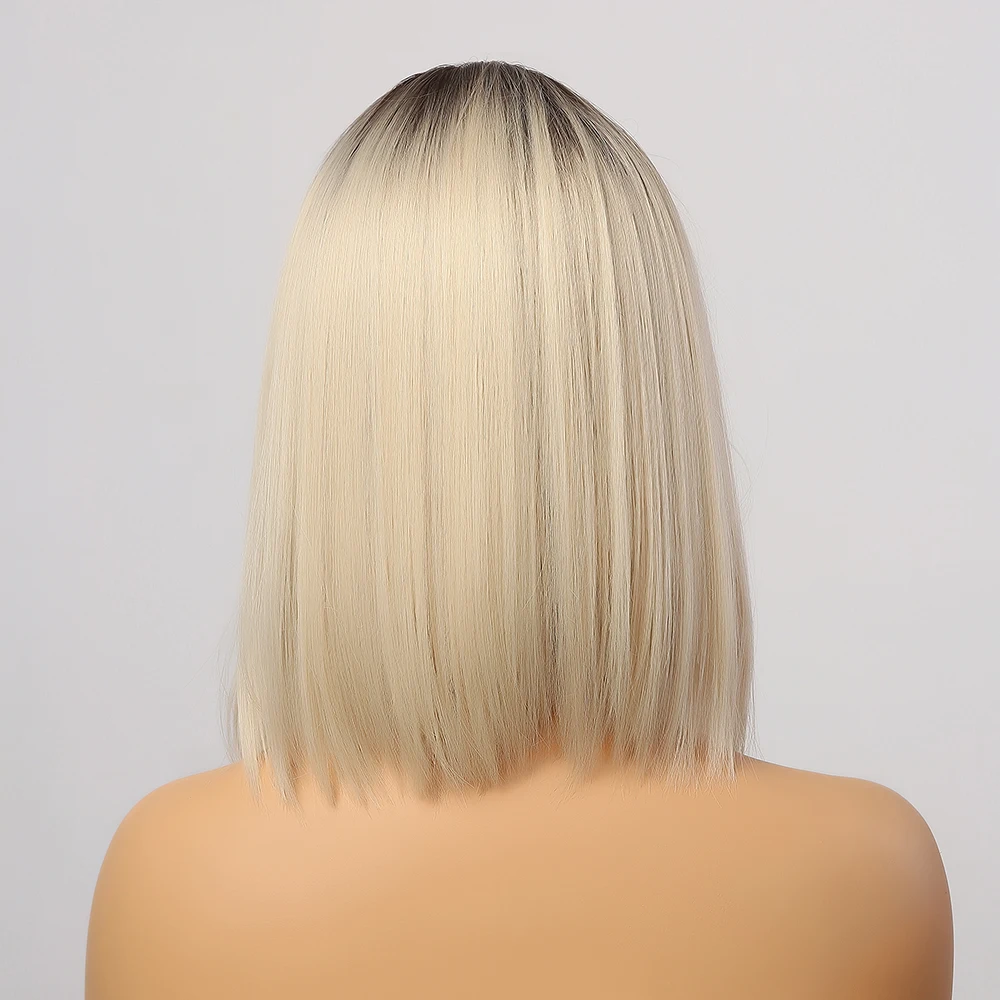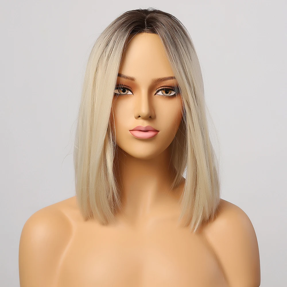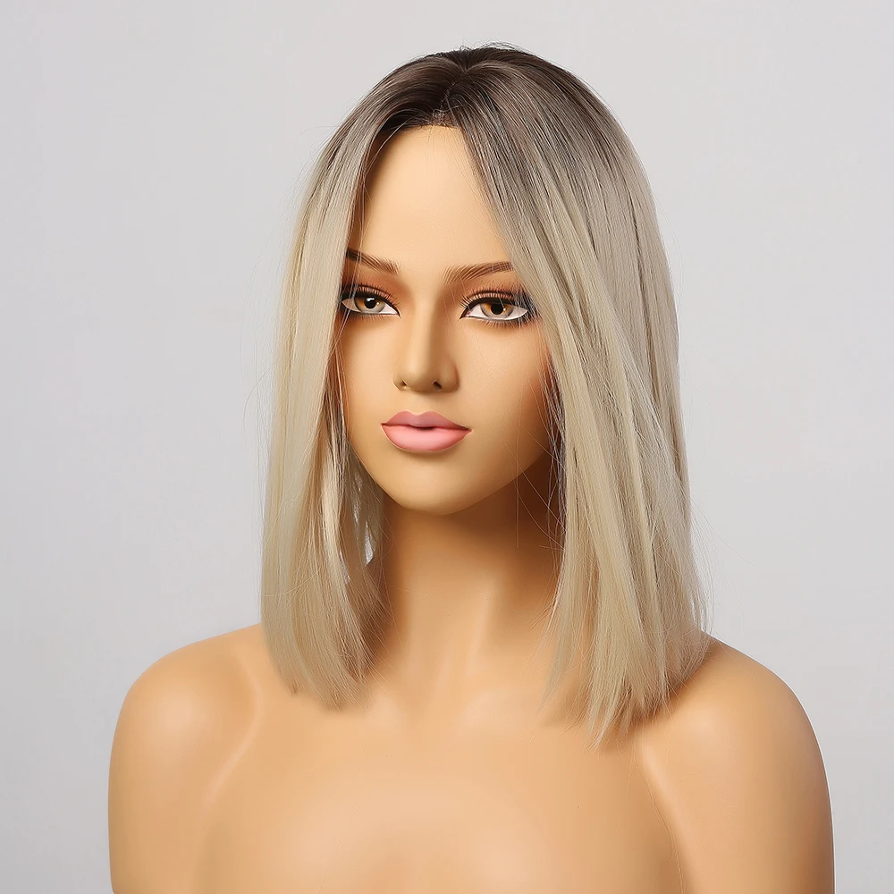 GEMMA Ombre Black Brown Blonde Straight Synthetic Hair Wigs For Women Natural Mdeium Middle Part Cosplay Heat Resistant Fiber