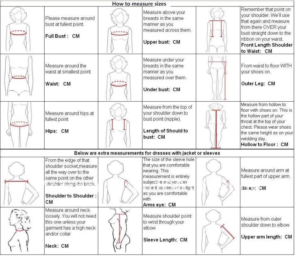 3. We do standard size or custom made size,the price is the same, please leave us your measurments if you choose custom made, please see below measuring instruction.