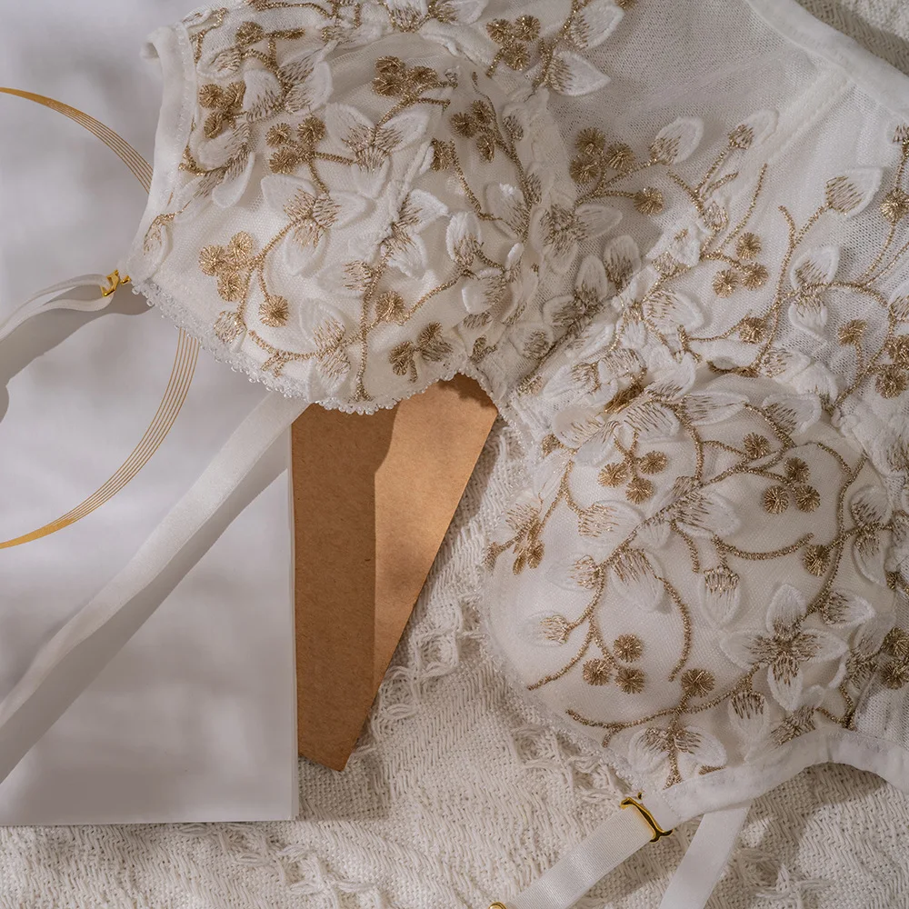 Honviey embroidered lingerie set girl’s thin sexy bralette set with underwear crop tops soft rim push up outside wear intimate