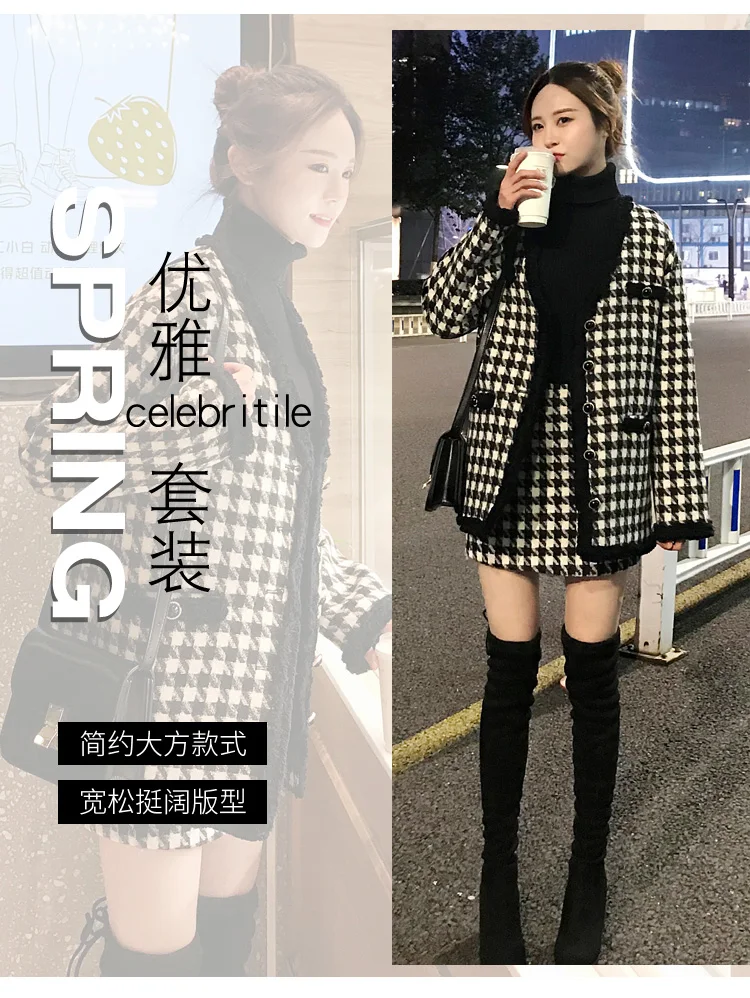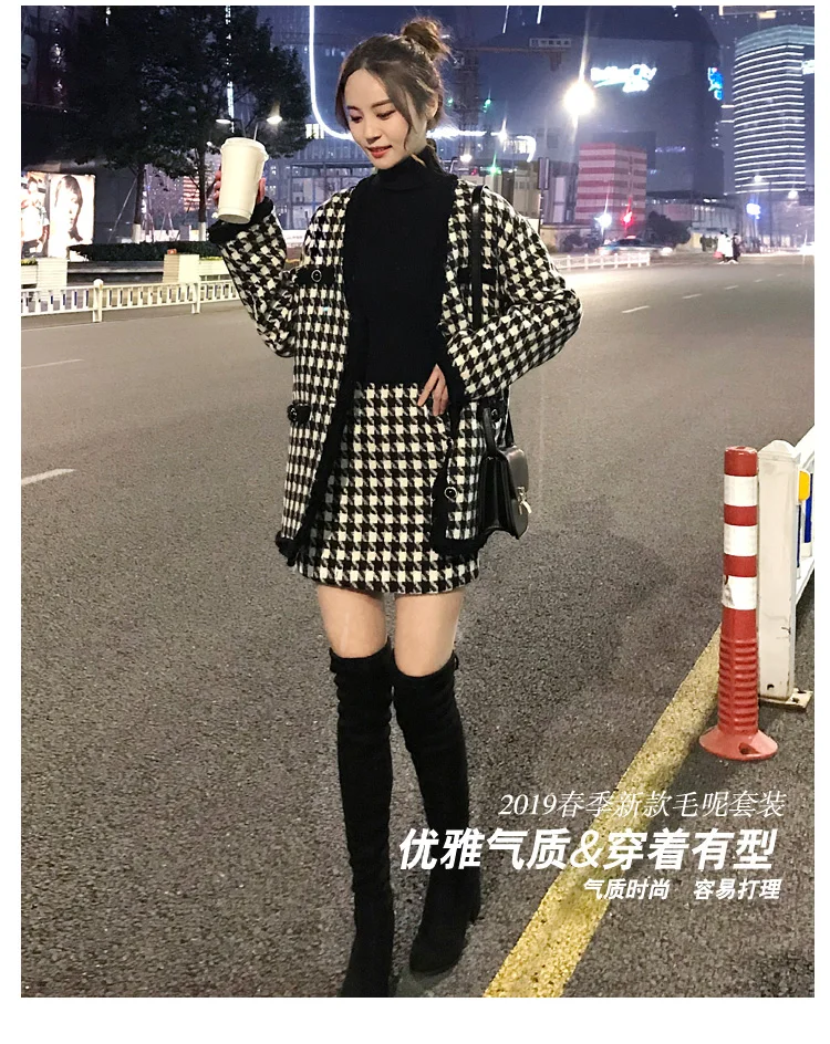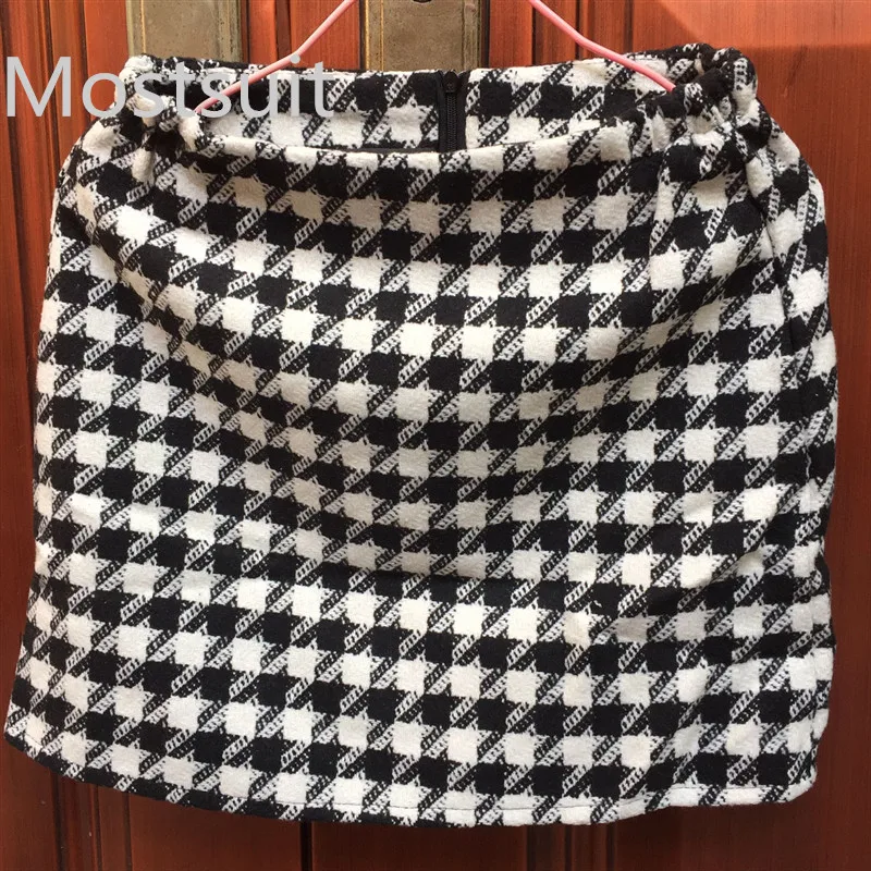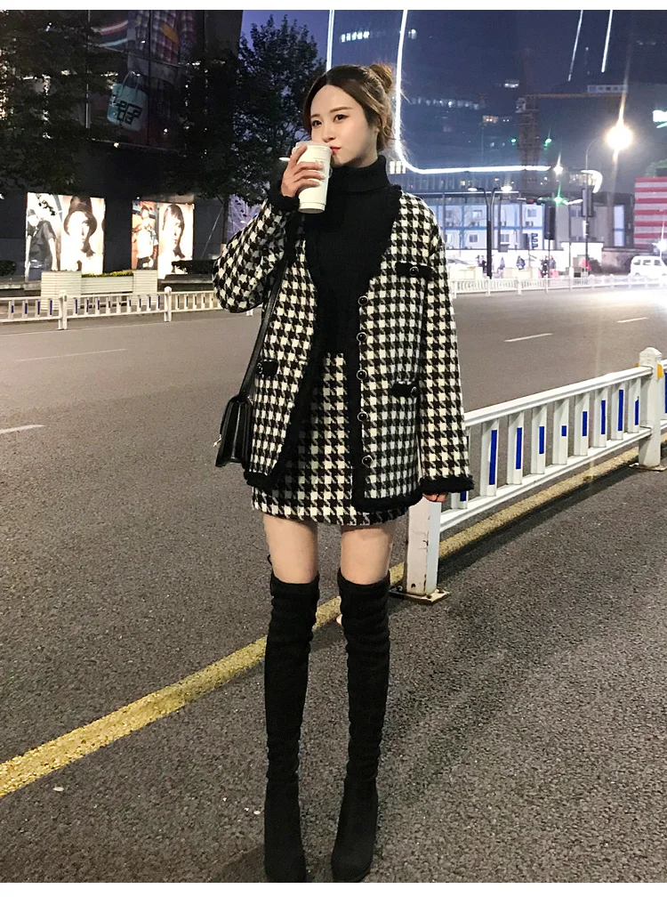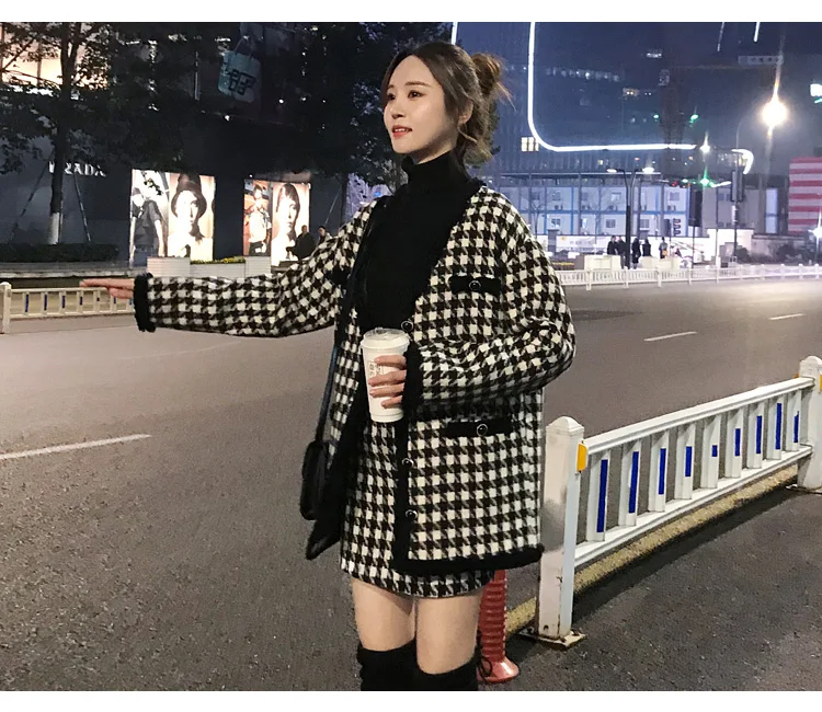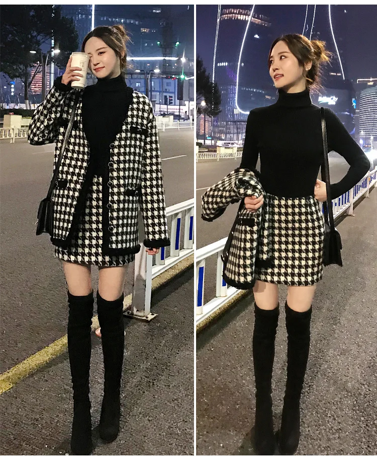 Houndstooth Vintage Two Piece Sets Outfits Women Autumn Cardigan Tops And Mini Skirt Suits Elegant Ladies Fashion 2 Piece Sets