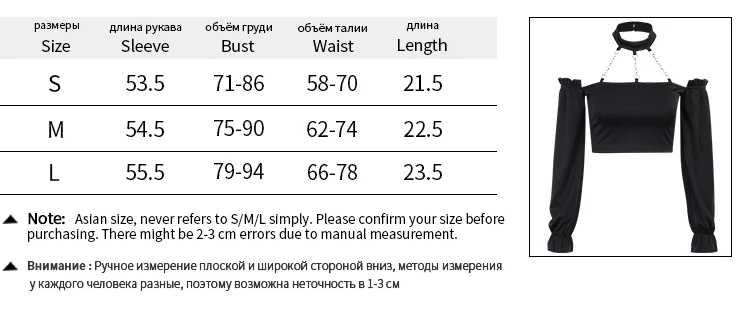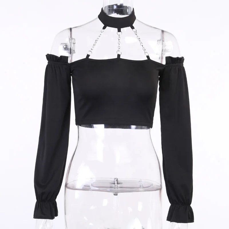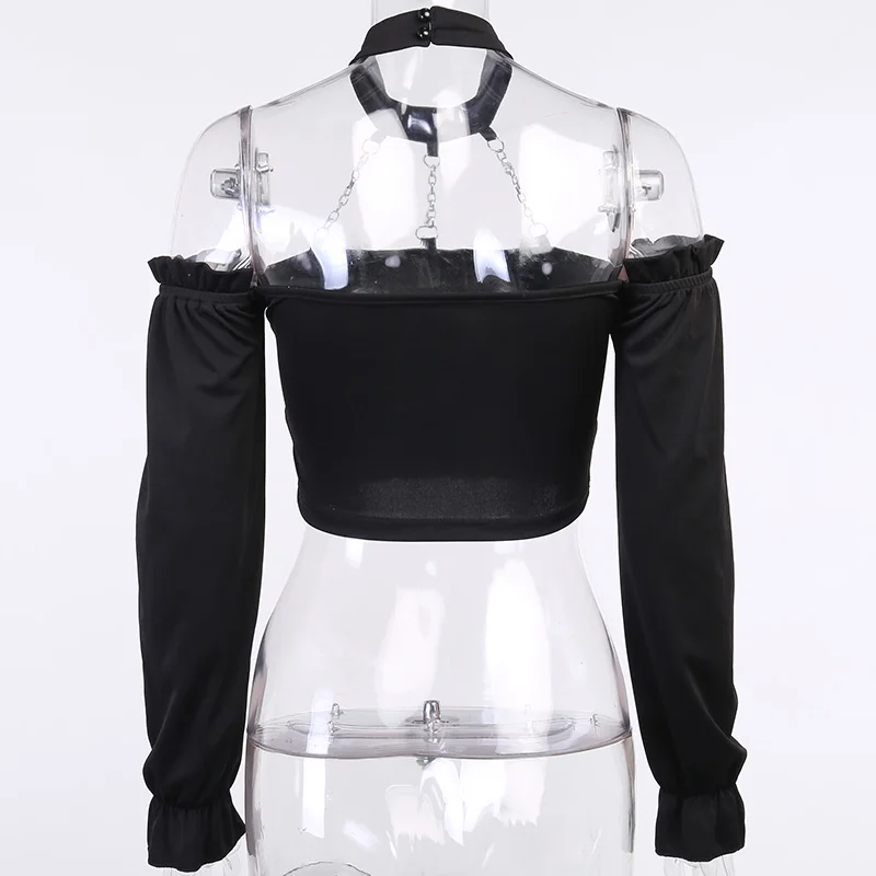 InsGoth Harajuku Streetwear Bodycon Off Shoulder Long Sleeve Tops Gothic Black Crop Tops Streetwear Punk Chain Matal Patchwork
