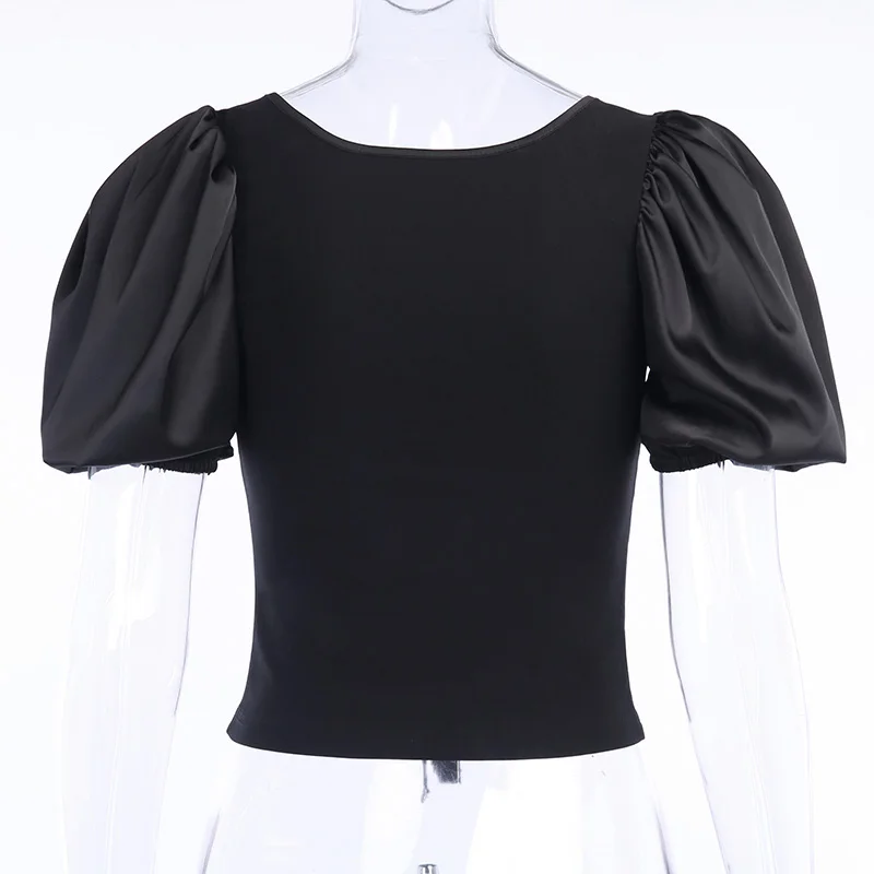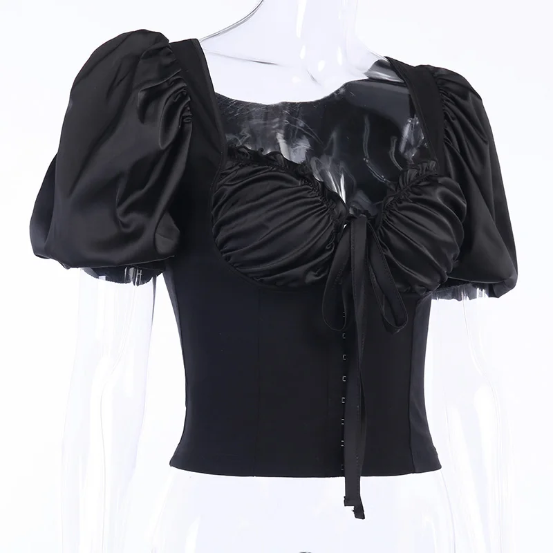 InsGoth Vintage Bodycon Tops Women Sexy Puff Short Sleeve Lace Up Streetwear Fashion Female Tops Black White Casual TShirts