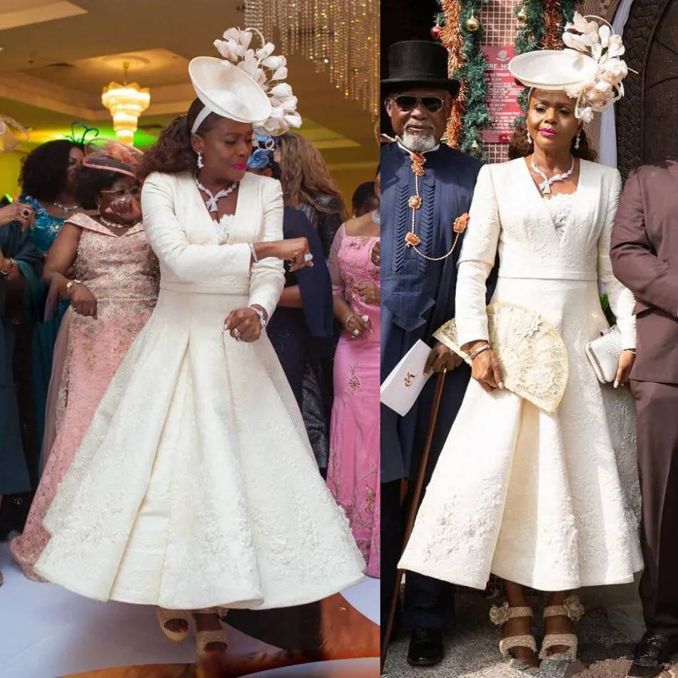 Ivory Tea-length Mother Of the Bride Groom Dresses 2020 Plus size V-neck Lace Floral Long Sleeve African Occasion Prom Dress