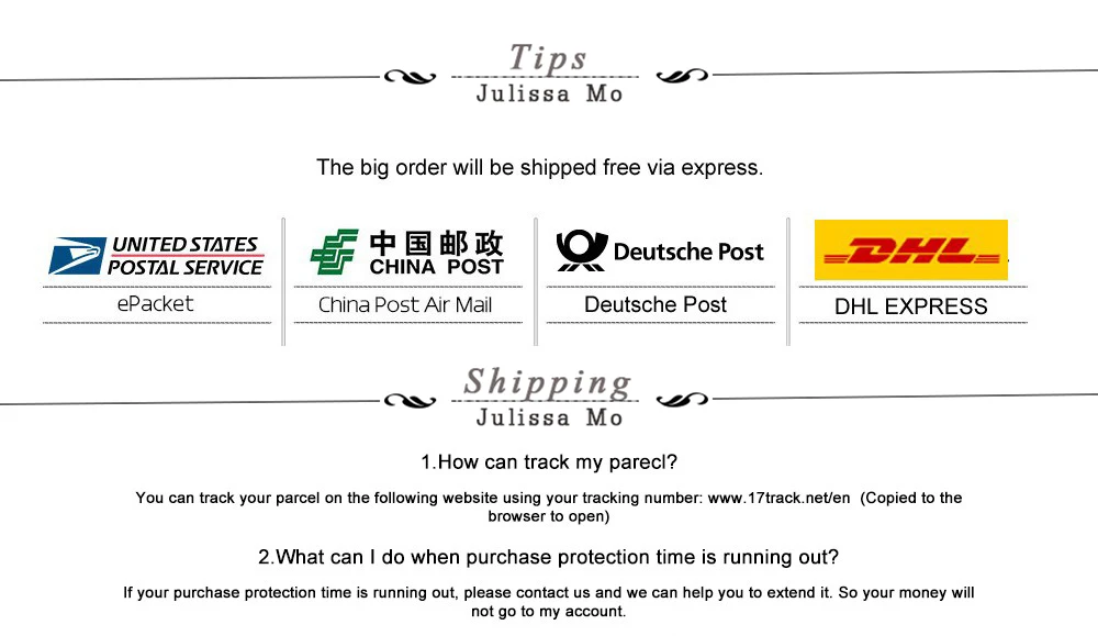 • If you did not receive the product within the guaranteed time( 45 days not including 2-5 day processing) you can request a refund or a reshipment.