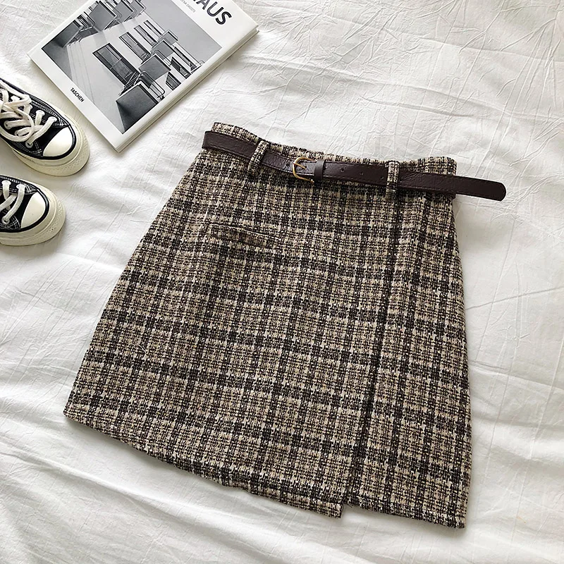Korean Irregular Lady Skirt Female Autumn Sweet High Waist A-line Mini Skirt Vintage Casual Women Plaid Skirt Chic Sashes