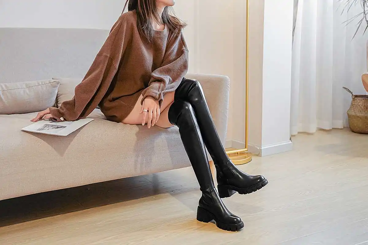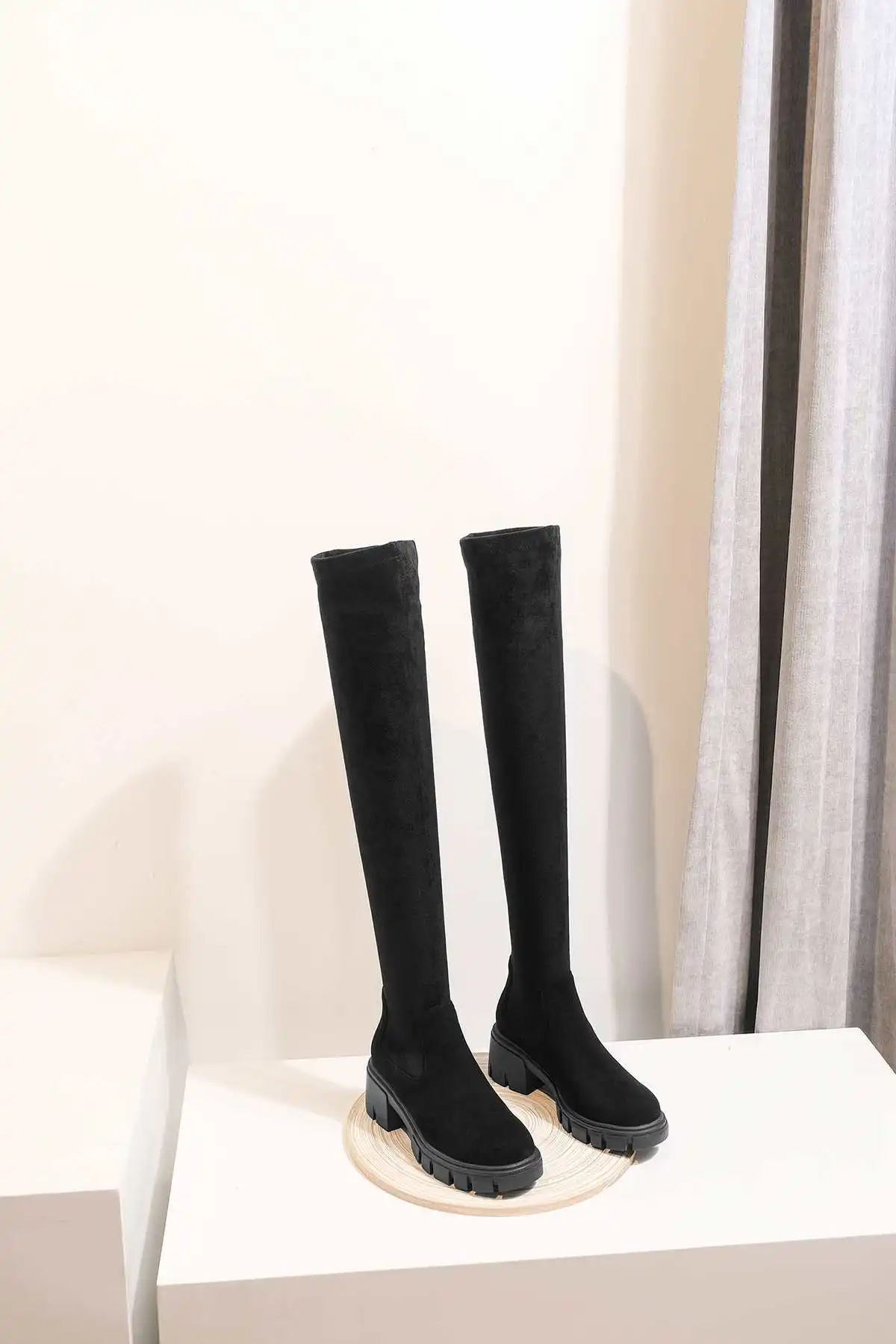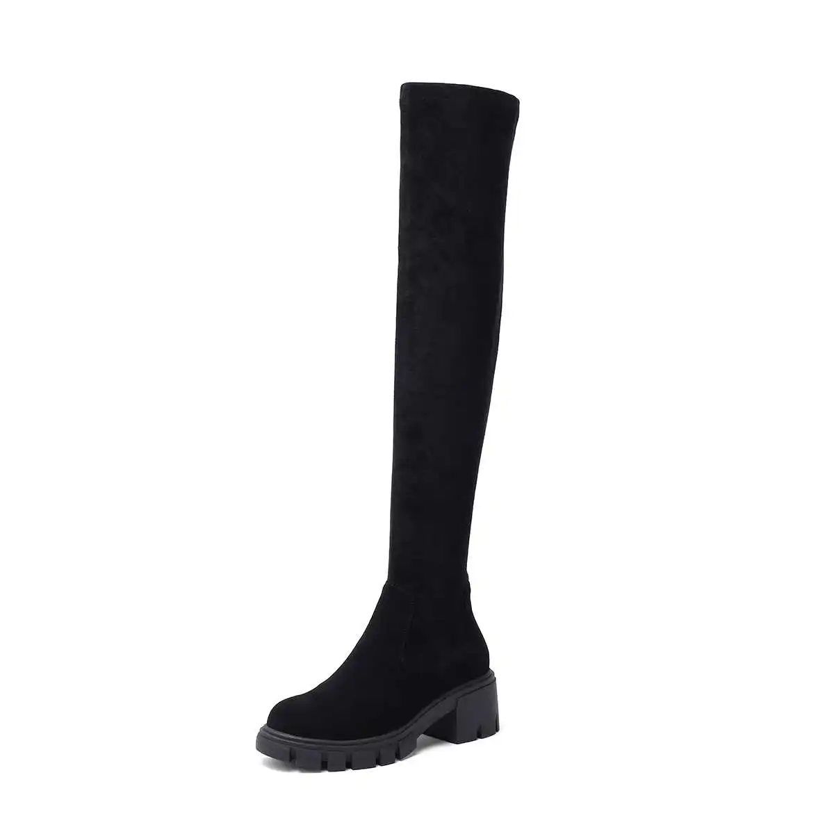krazing pot simple style popular cow leathe stretch boots round toe high heels winter women keep warm solid thigh high boots L10