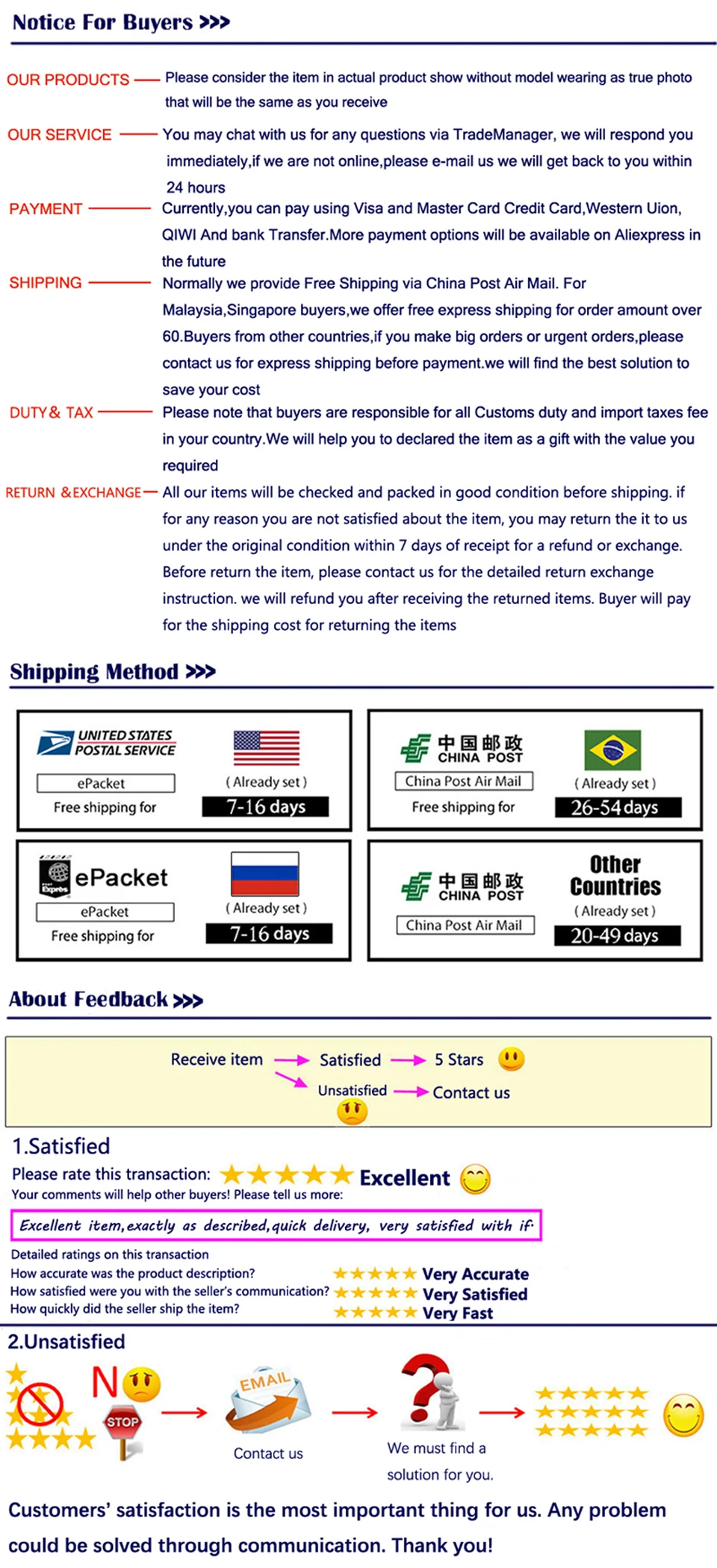 • If you did not receive the product within the guaranteed time( 45 days not including 2-5 day processing) you can request a refund or a reshipment.
