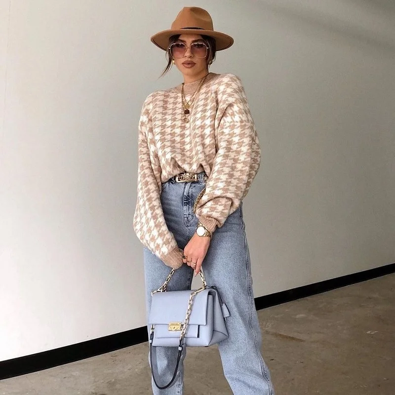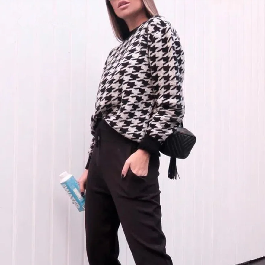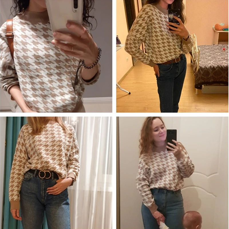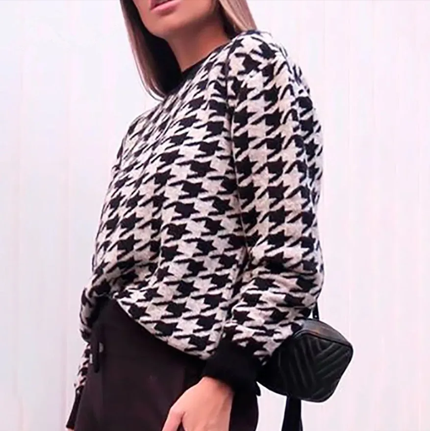 Ladies Knitted Autumn Winter Sweater Women Pullover Casual Houndstooth Warm Soft Slim Sweaters Female Pull Knitwear Retro Jumper