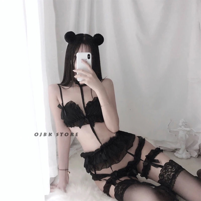 Lolita Women Sexy Lingerie Set Cute White Ruffles Lace Ladies Kawaii Babydoll Soft Girl Black Pajamas Cosplay Costumes Gifts