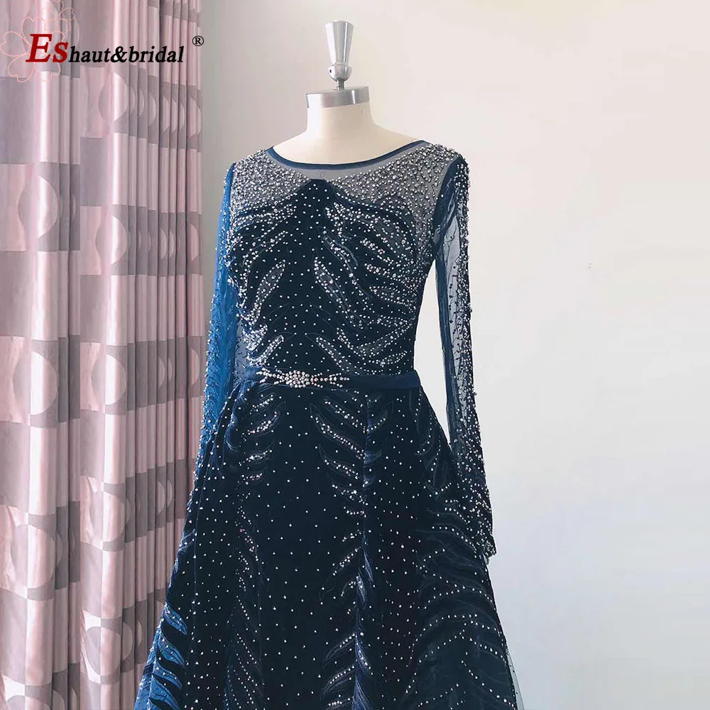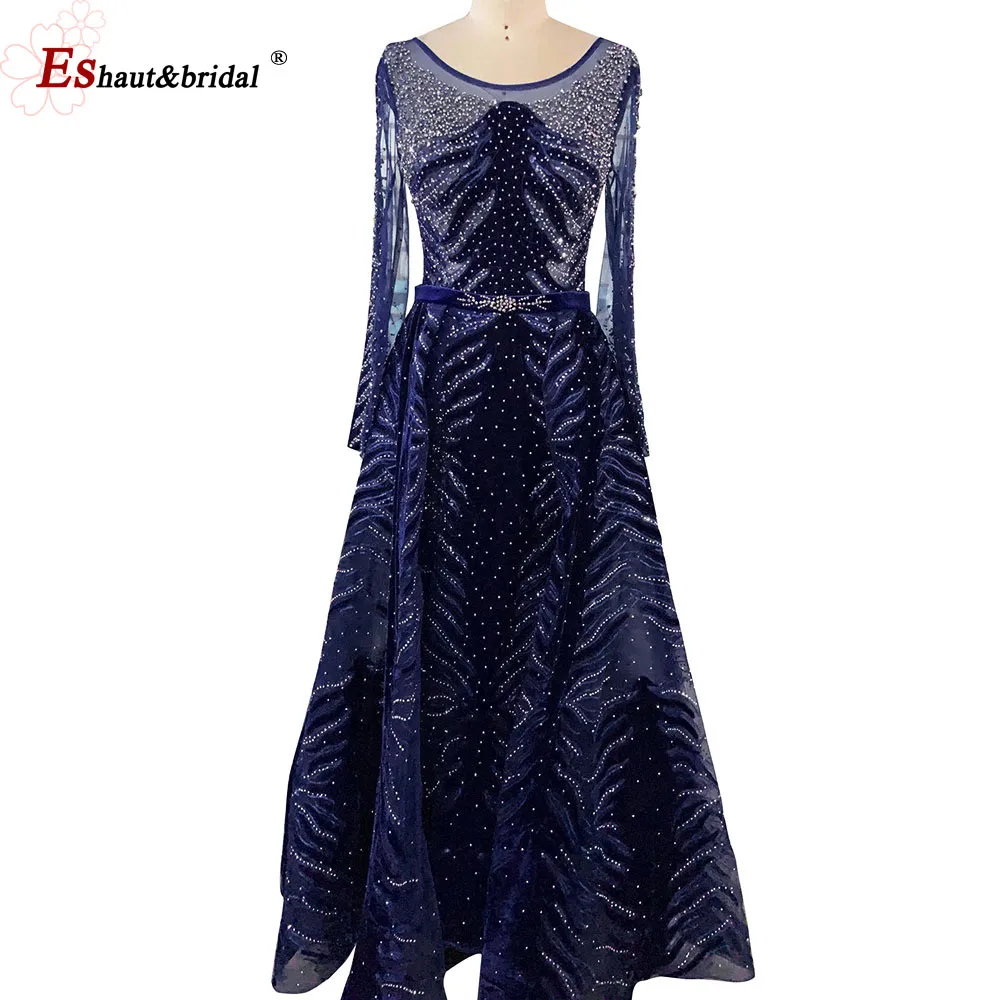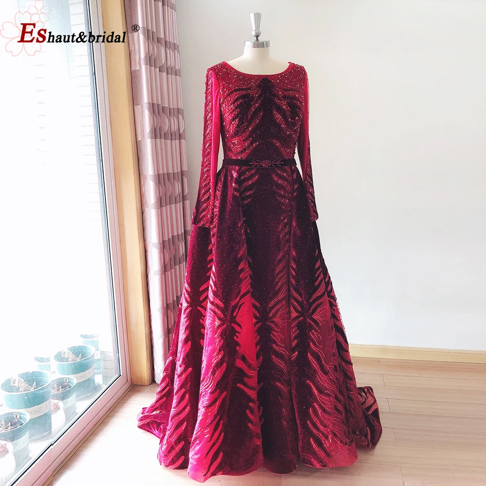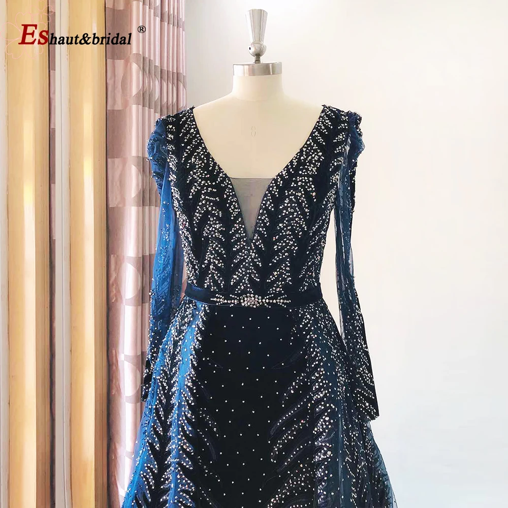 Luxury Dubai Evening Dress Mermaid 2020 V-Neck Long Sleeves Velvet Crystal Handmade Arabic Plus Size Formal Prom Party Gowns