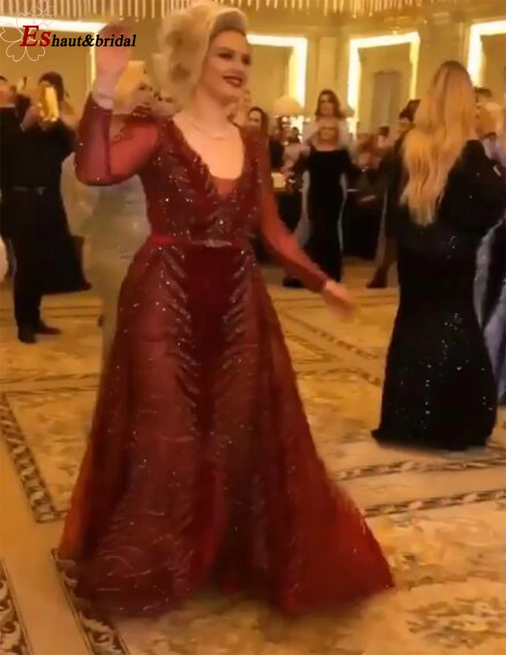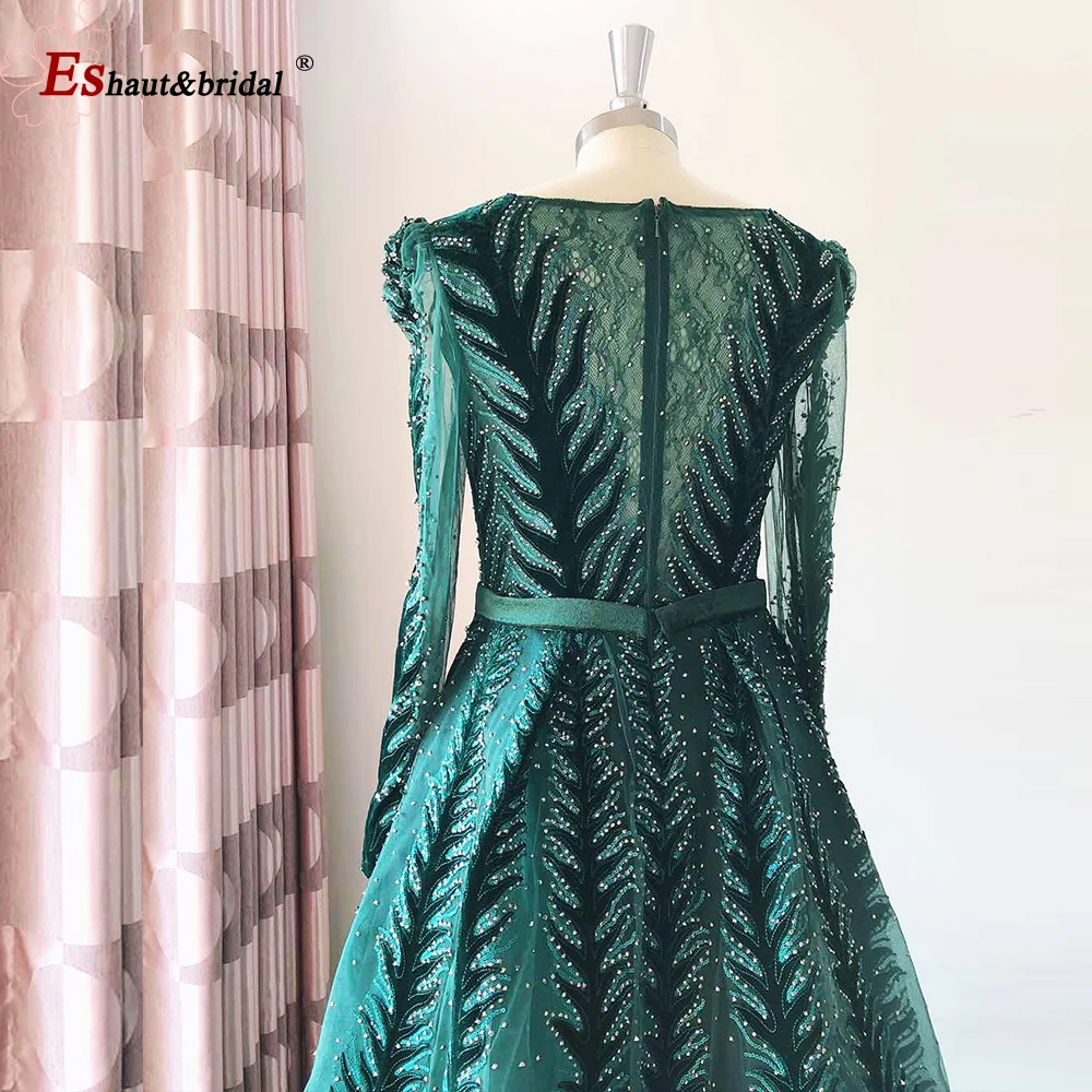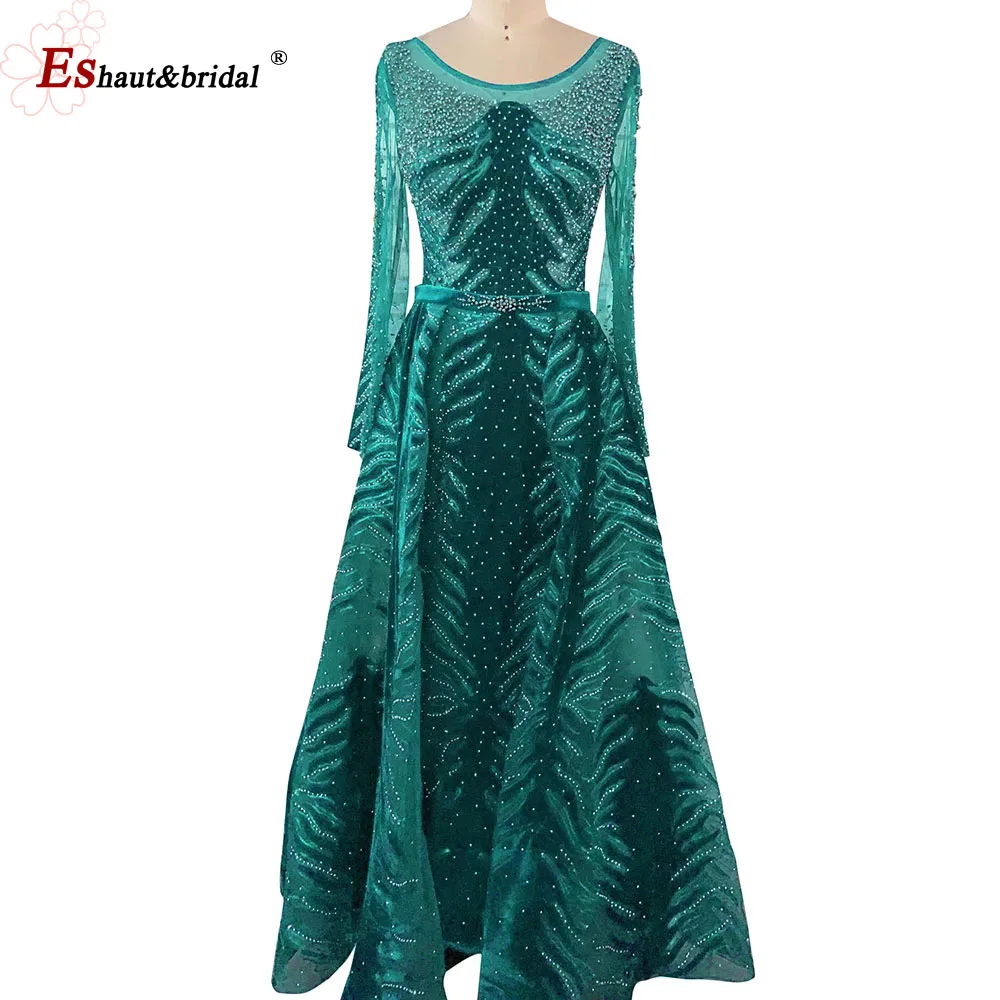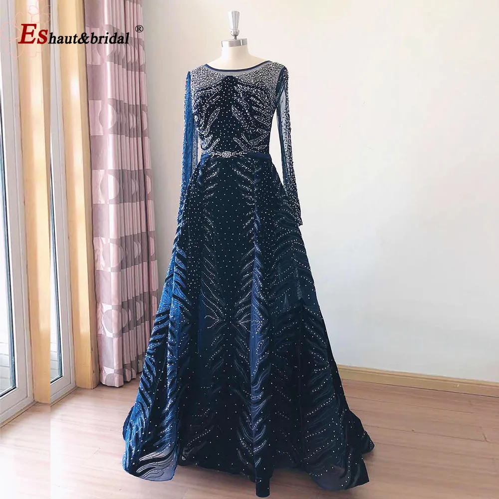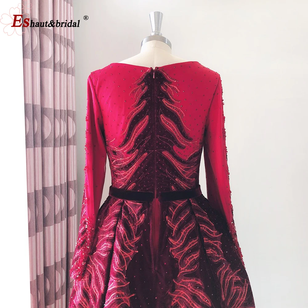 Luxury Dubai Evening Dress Mermaid 2020 V-Neck Long Sleeves Velvet Crystal Handmade Arabic Plus Size Formal Prom Party Gowns