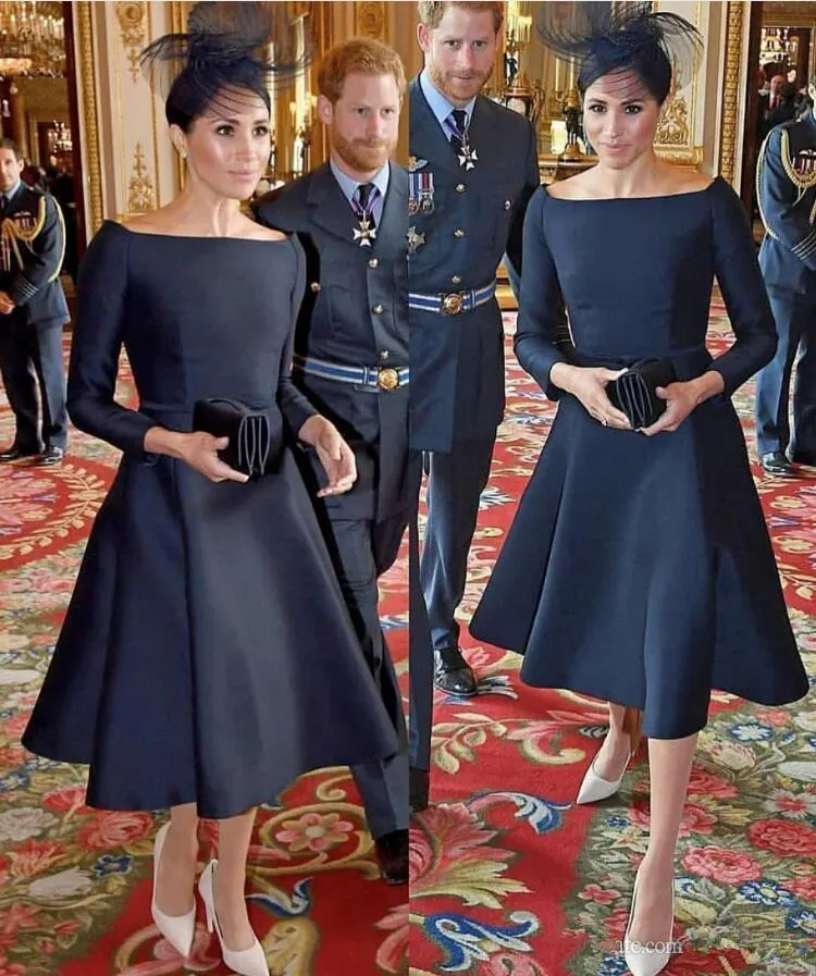 Navy Blue Tea-length Mother of The Bride Dresses with Long Sleeve 2020 Harry Meghan Arabic Dubai Occasion Prom Formal Dress