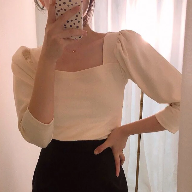 Neploe Solid T Shirts Women Spring 2021 Chic Korean Square Collar Puff Sleeve Ladies Tees Fashion Slim Fit Female Tops 1A367