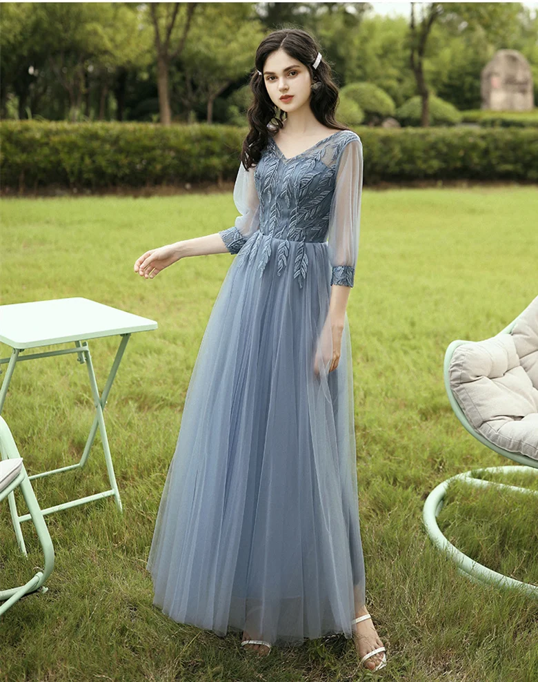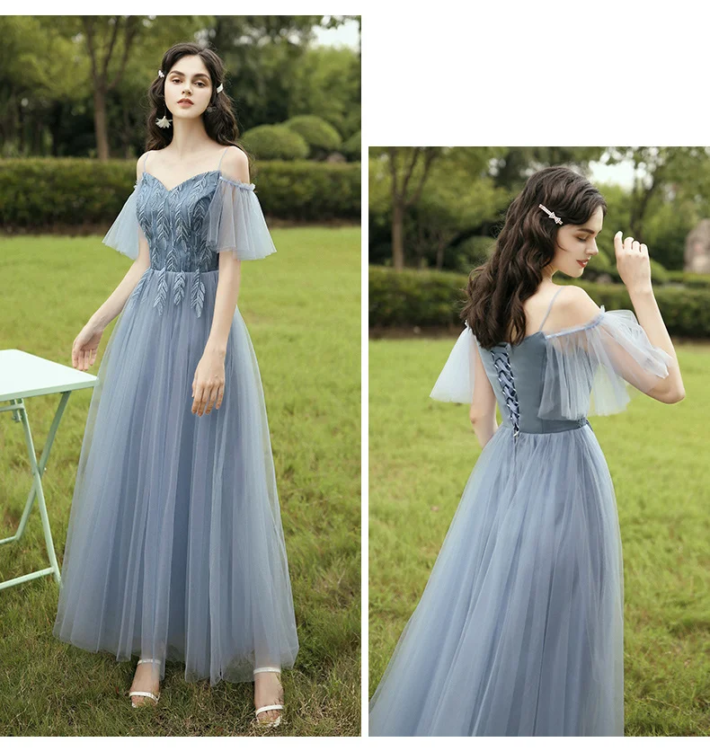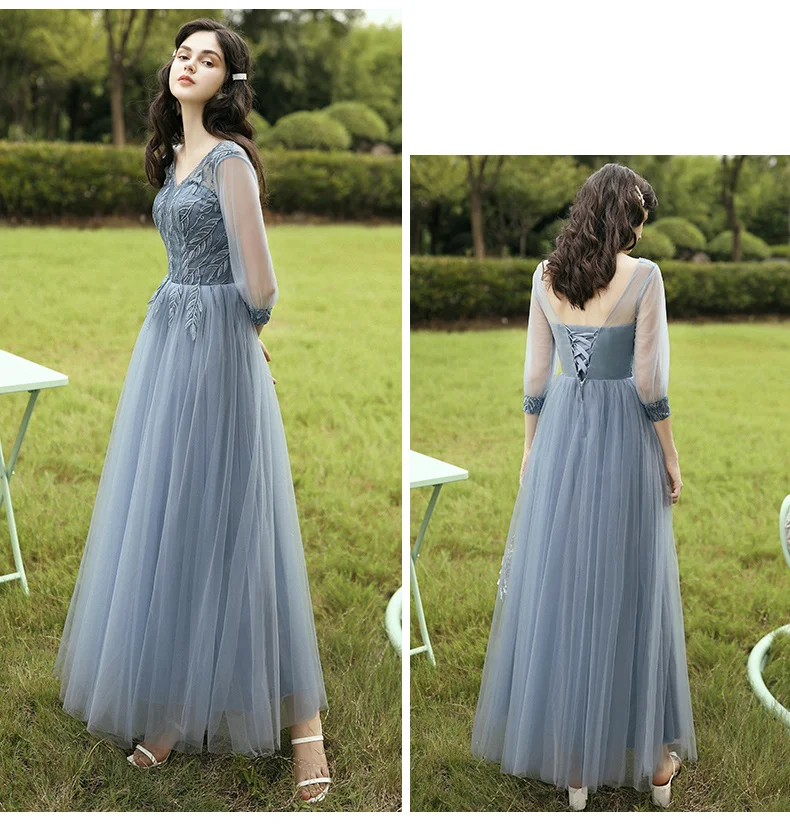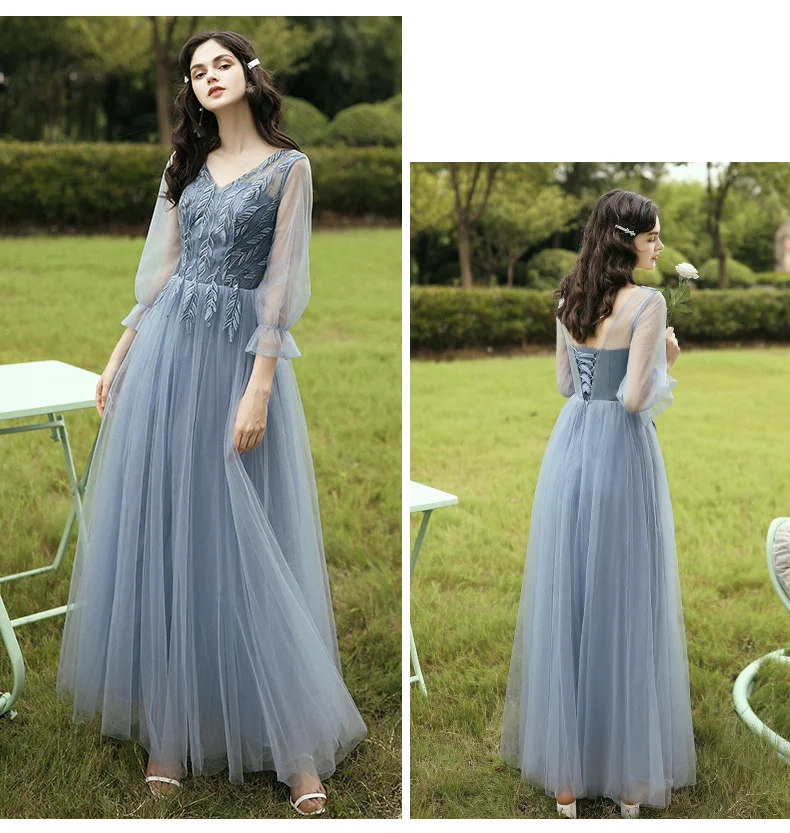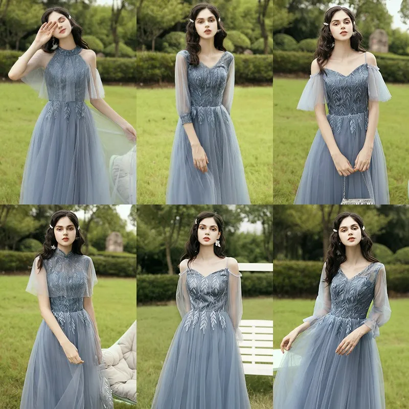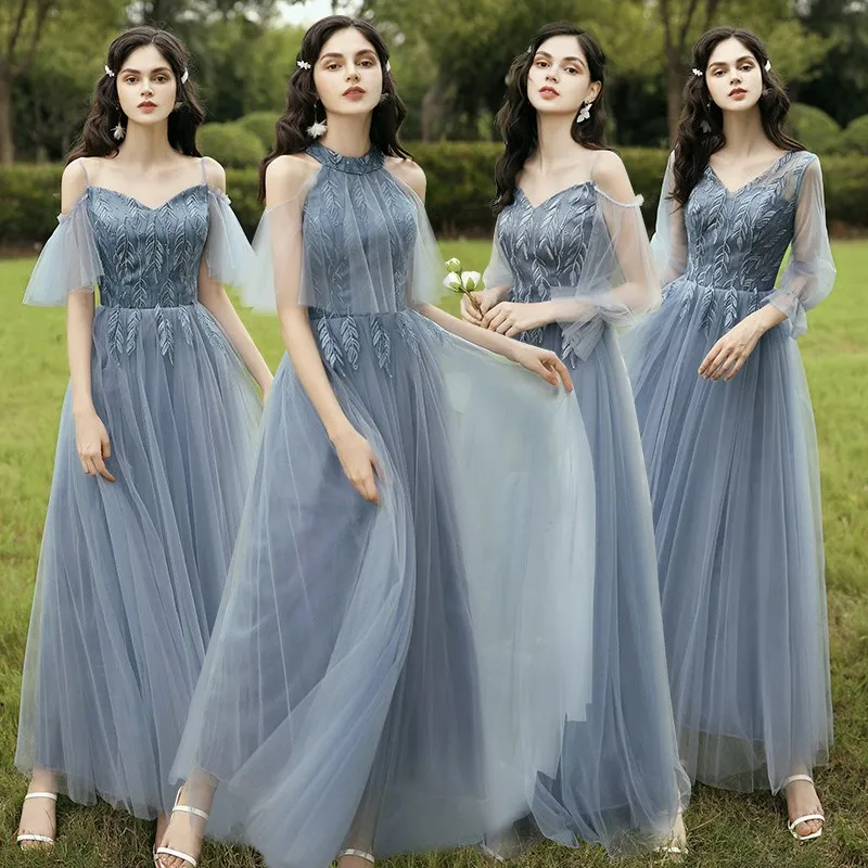 New Dusty Blue Mix and Match Bridesmaid Dresses Appliques Flowers Fall Blush Bride Prom Party Gown Cheap Robe De Soriee 2020