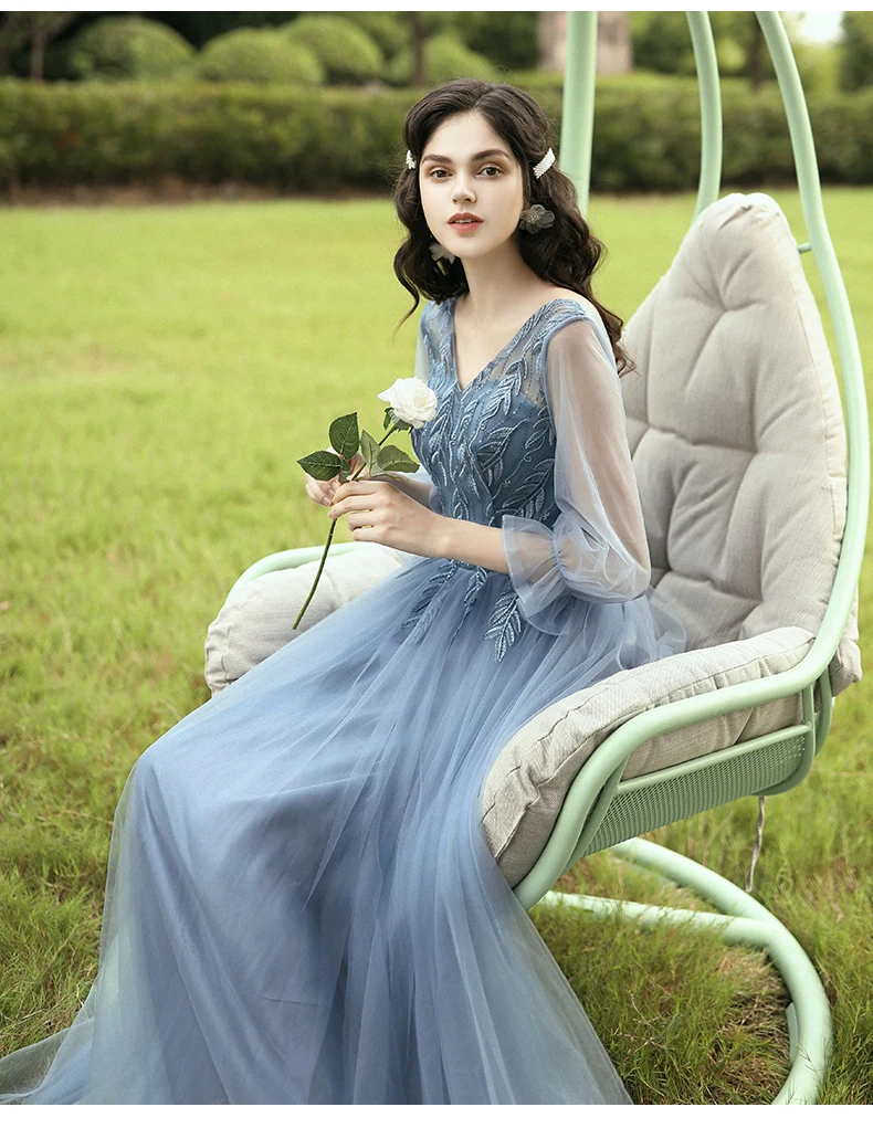 New Dusty Blue Mix and Match Bridesmaid Dresses Appliques Flowers Fall Blush Bride Prom Party Gown Cheap Robe De Soriee 2020