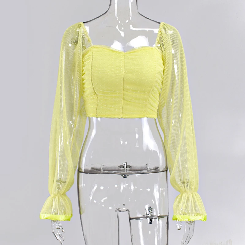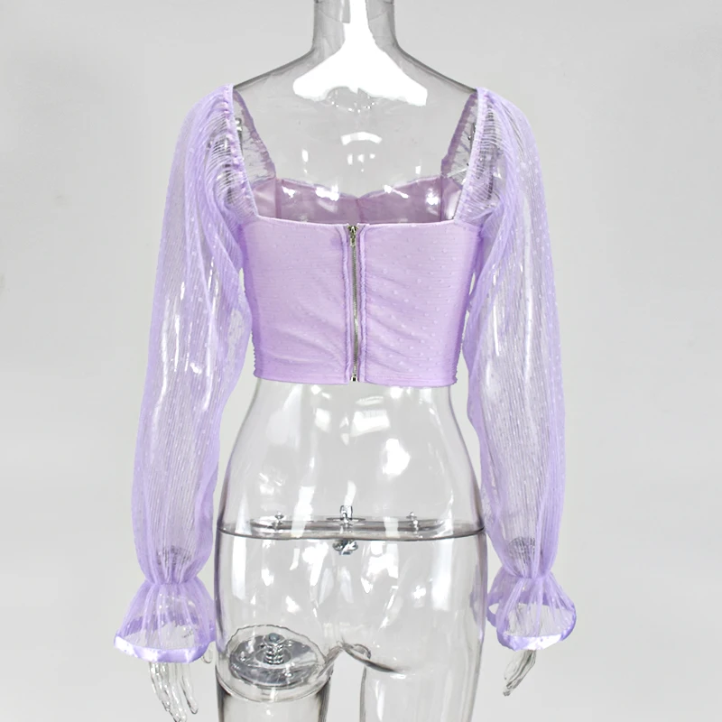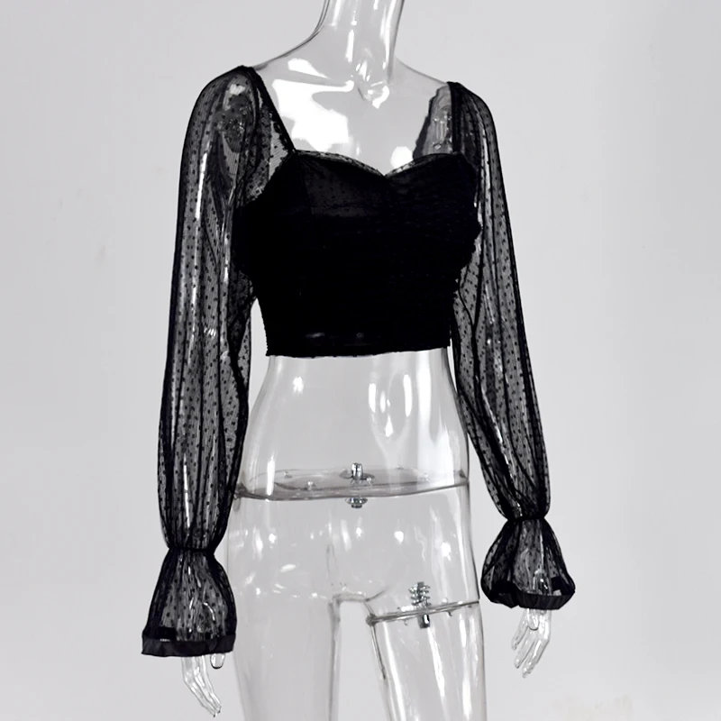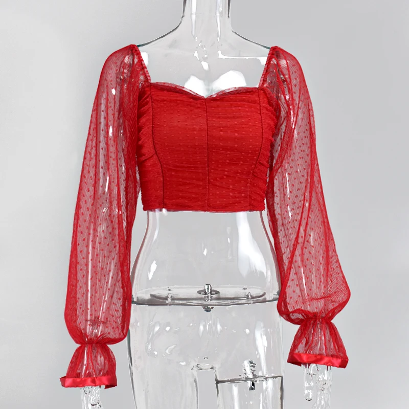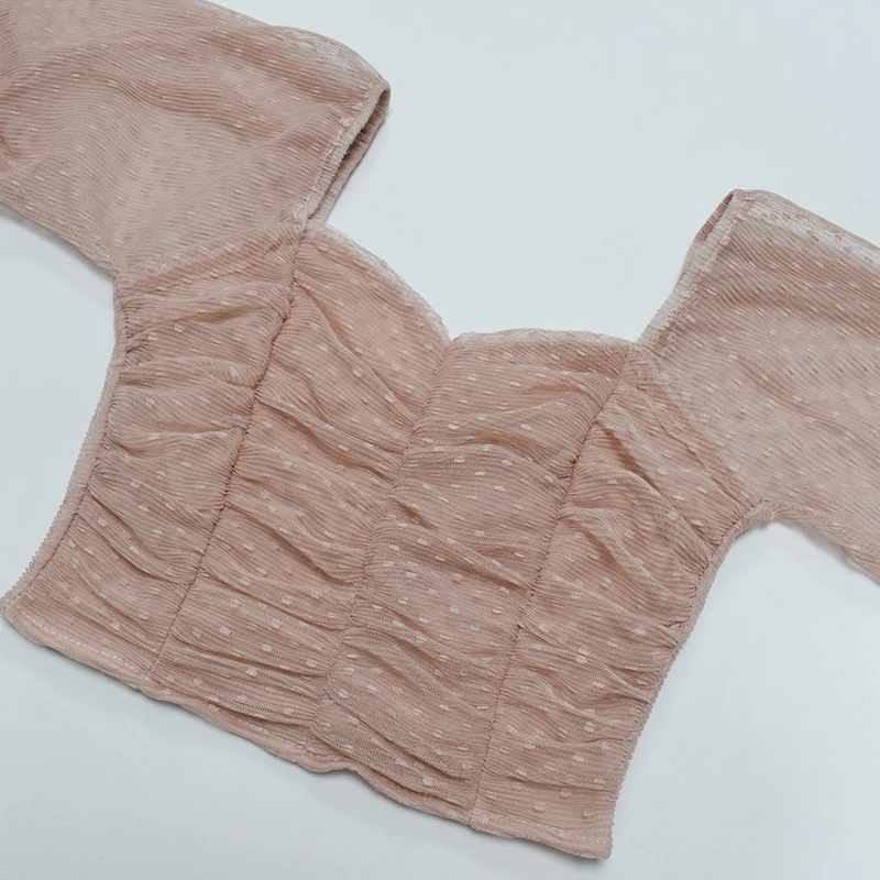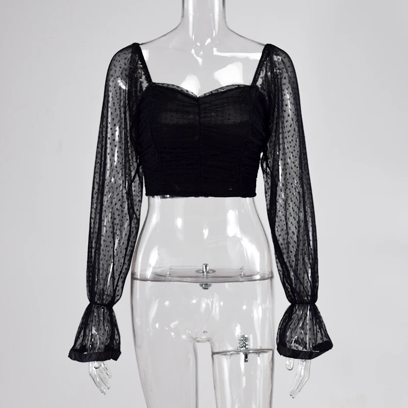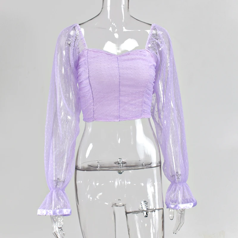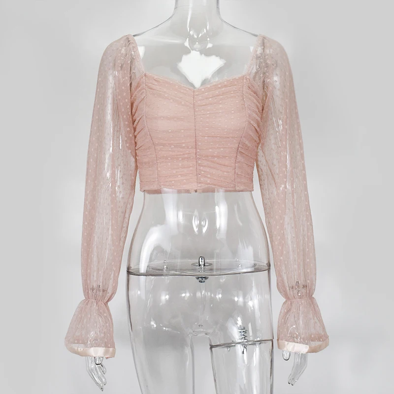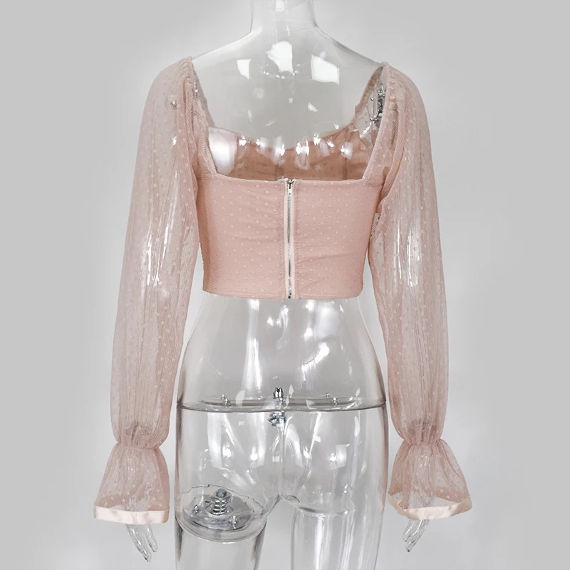 NewAsia Garden Sweet Pink Blouse Women Puff Sleeve Ruffles Mesh Polka Dot Tops Vintage Big Square Collar Solid Color Blusas 2020