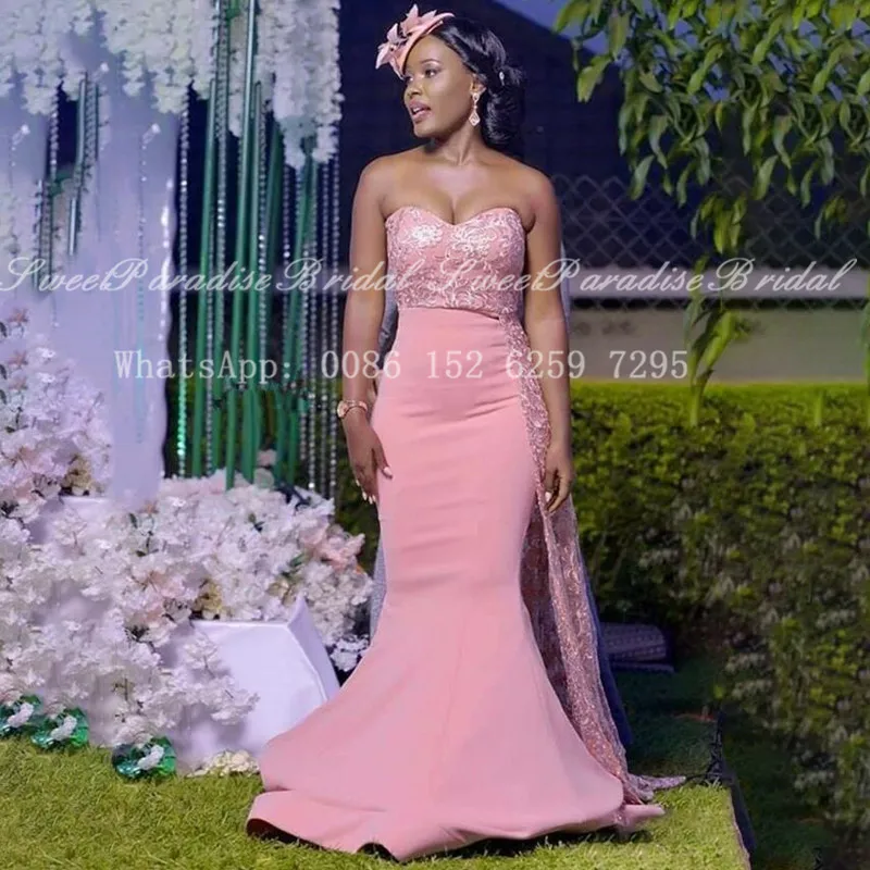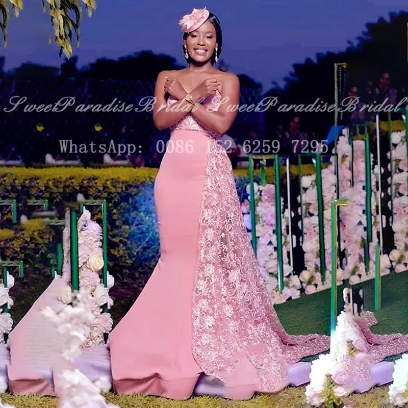Newest Mermaid Pink Lace Bridesmaid Dresses 2020 Long Sweetheart Neck African Women Overskirt Wedding Party Dress Prom Vestidos