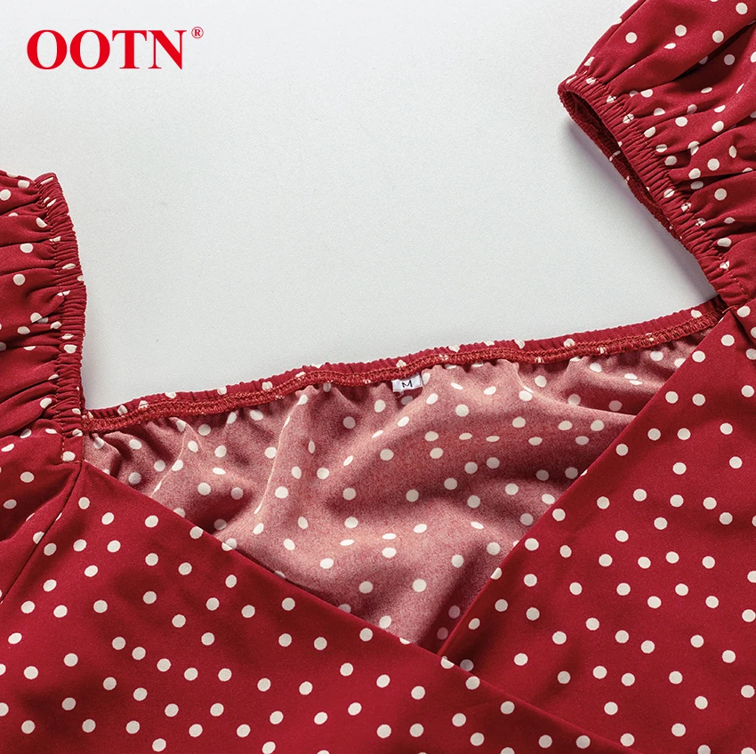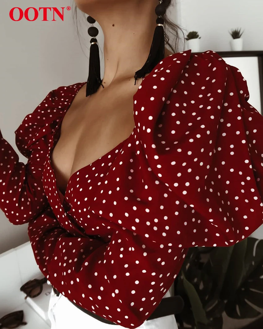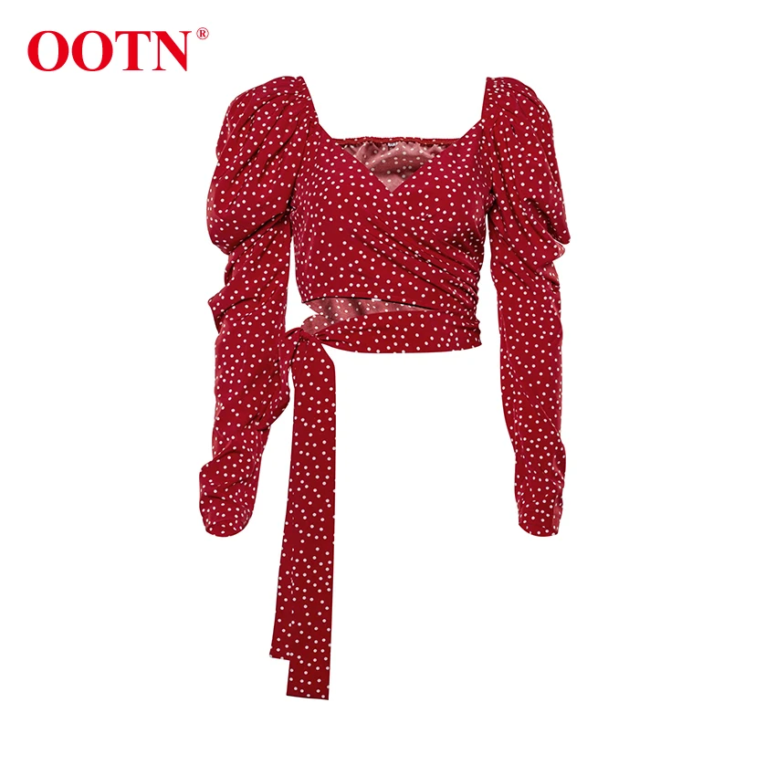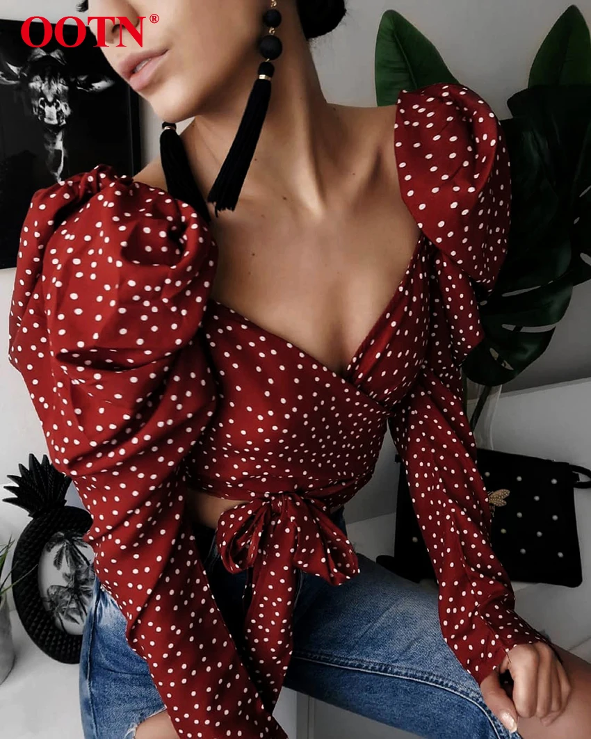 OOTN Vintage Polka Dot Women Puff Long Sleeve Wrap Top Elegant 2020 Lace Up Red Crop Top Blouse Sexy Backless Chic Female Shirts