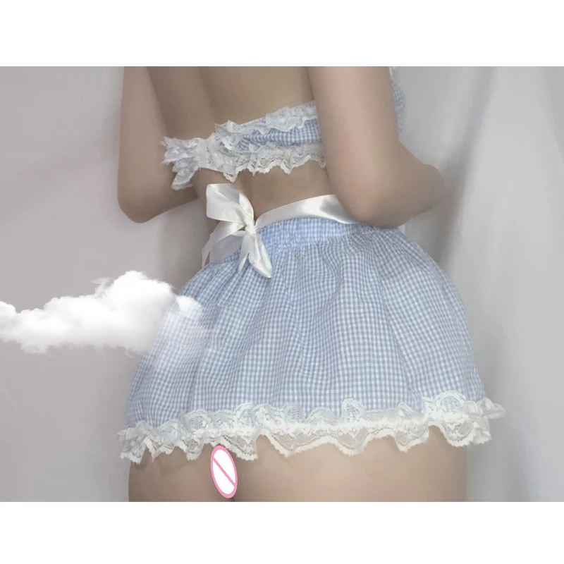 Paloli Sexy Underwear Sexy Lovely Maid Skirt Blue Plaid Nightdress Girl Bra Top Vest Lace Kawaii Uniform Temptation Set