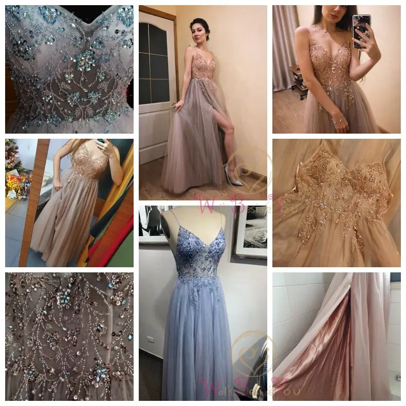 Pink Beaded Prom Dresses Plus Size 2020 Long Elegant See Through A Line Split Tulle V Neck Spaghetti Strap Evening Gown