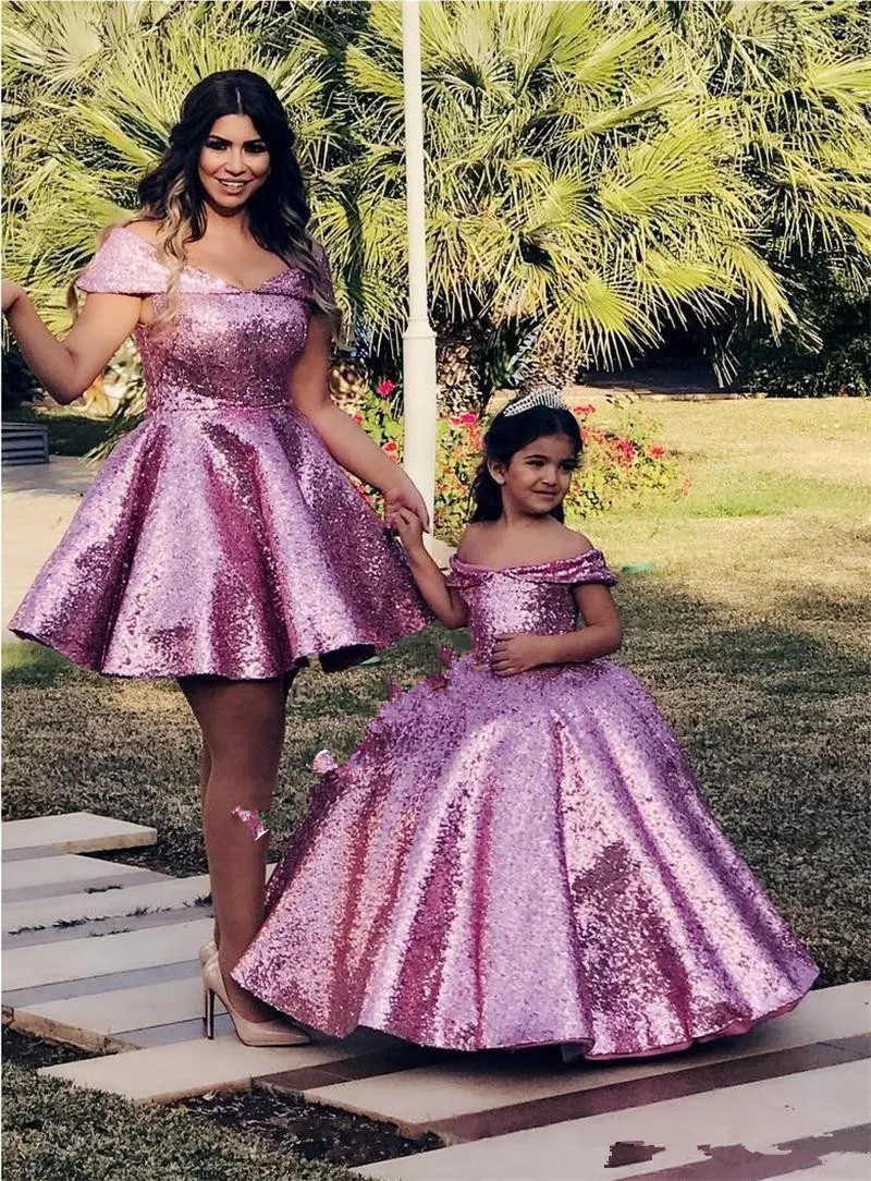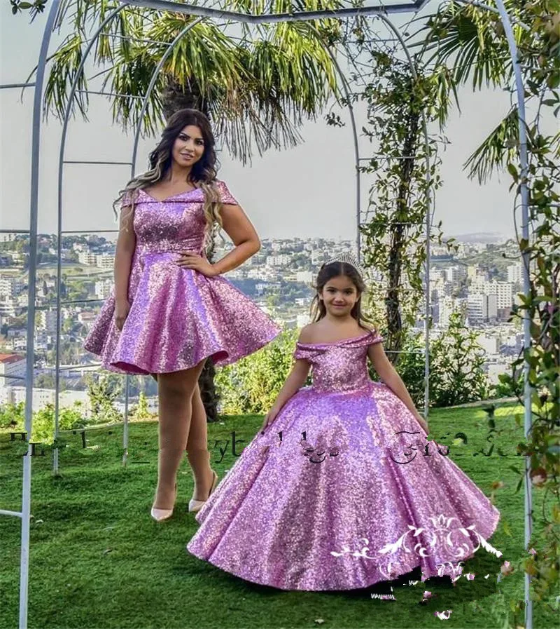 Pink Sequined Ball Gown Mother and Daughter Dresses 2020 Off Shoulder Plus Size Cheap Family Matching Formal Prom Party Gowns
