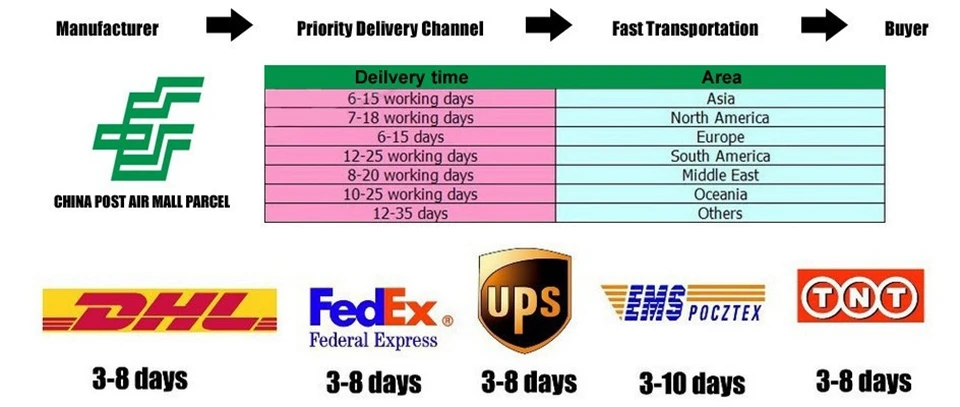 Packages from our warehouse in China will be shipped by ePacket or EMS depending on the weight and size of the product. Packages shipped from our US warehouse are shipped through USPS.