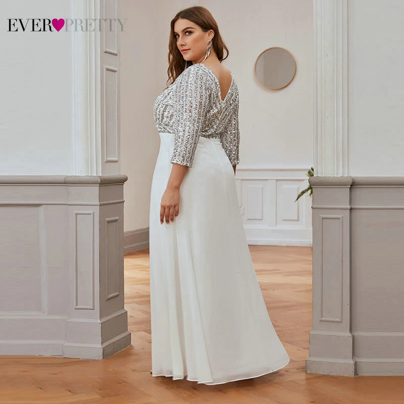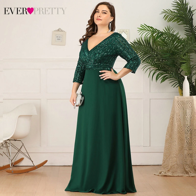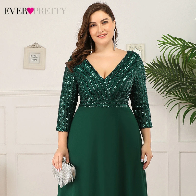 Plus Size Sequined Evening Dresses Ever Pretty 3/4 Sleeve A-Line Double V-Neck Elegant Sparkle Party Gowns Abiye Gece Elbisesi