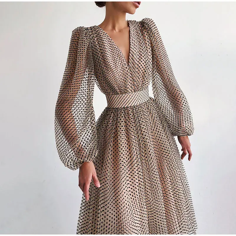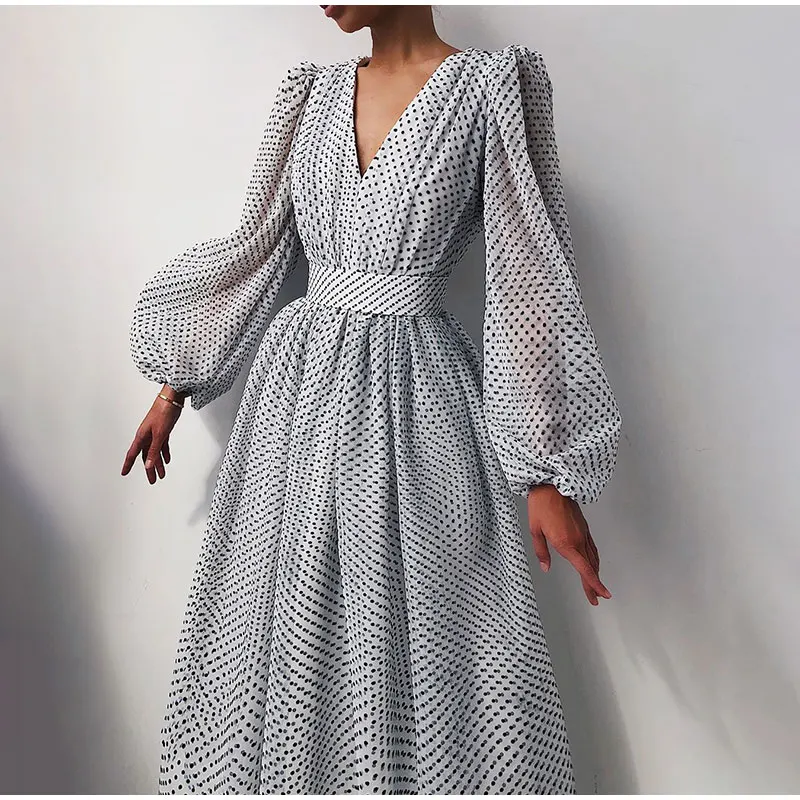 Polka Dot A-line Women’s Midi Dress V-neck Long Lantern Puff Sleeve Elegant Female Dresses 2021 New Sweet Christmas Party Cloth