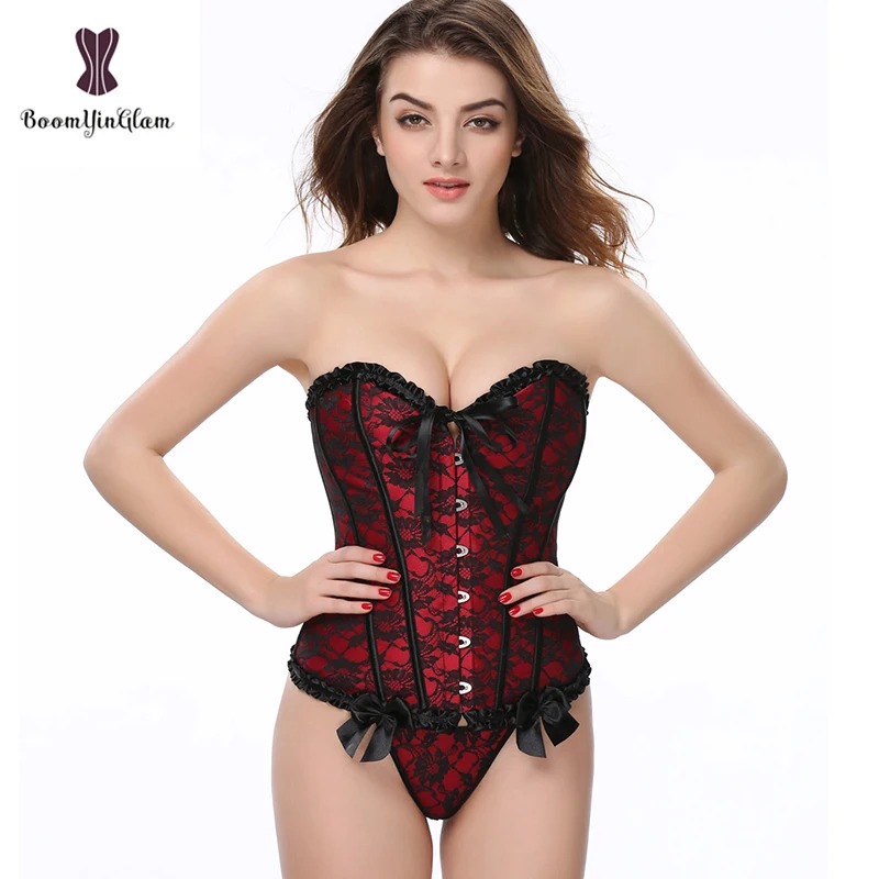 Red Women Mesh Grid Lingerie Basque Corselet Bustier Floral Lace Overlay Corset Overbust Plus Size 805#
