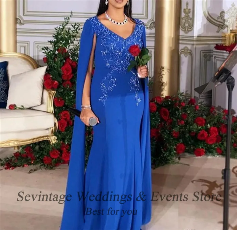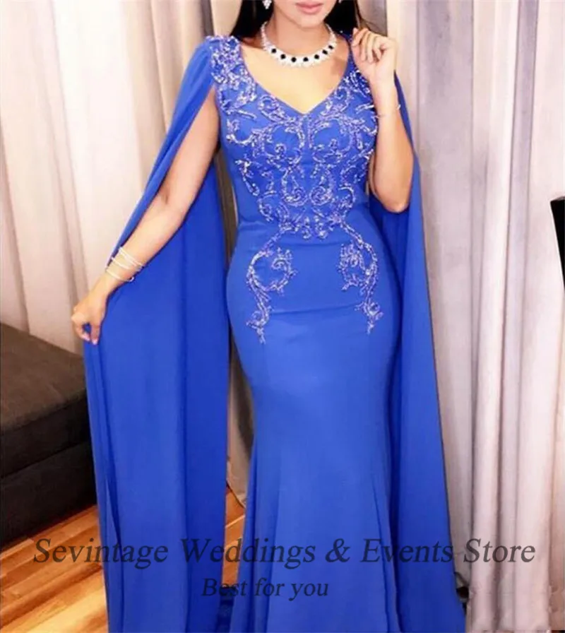Sevintage 2020 Blue Arabic Celebrity Dress With Cape Lace Applique Beads Mermaid Dubai Long Prom Dress Formal Gowns Abendkleider