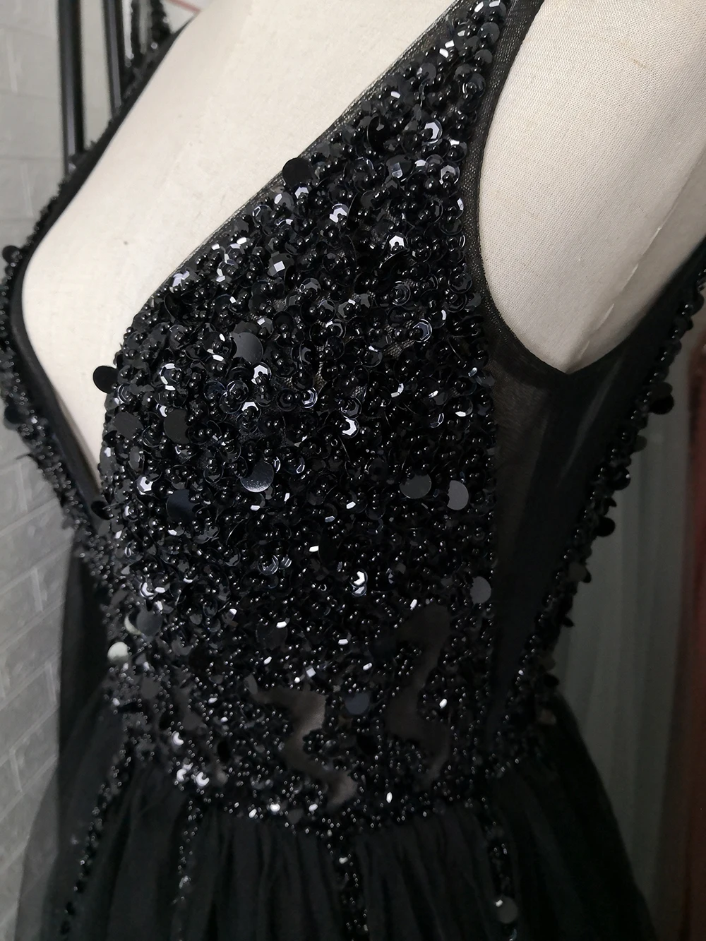 Sexy V-Neck Black Long Evening Dress 2019 New Arrivals Backless Sparkly High Slit See Through Abendkleider Lang