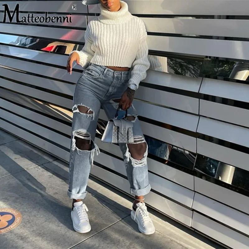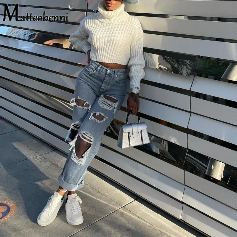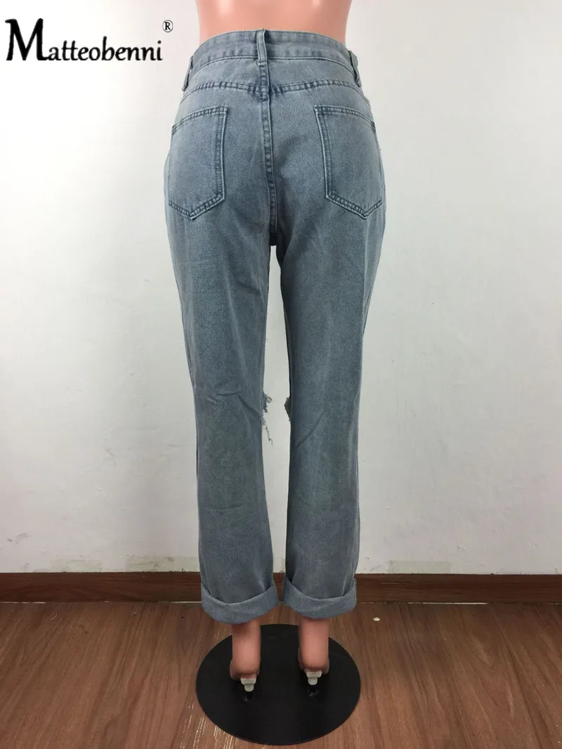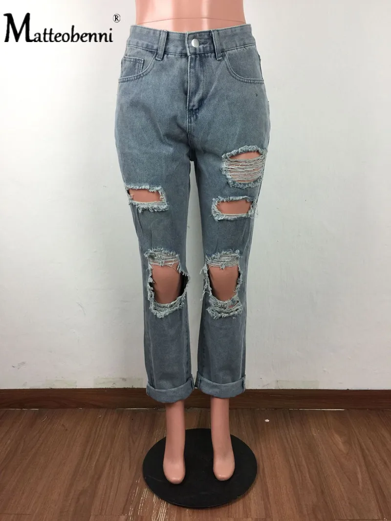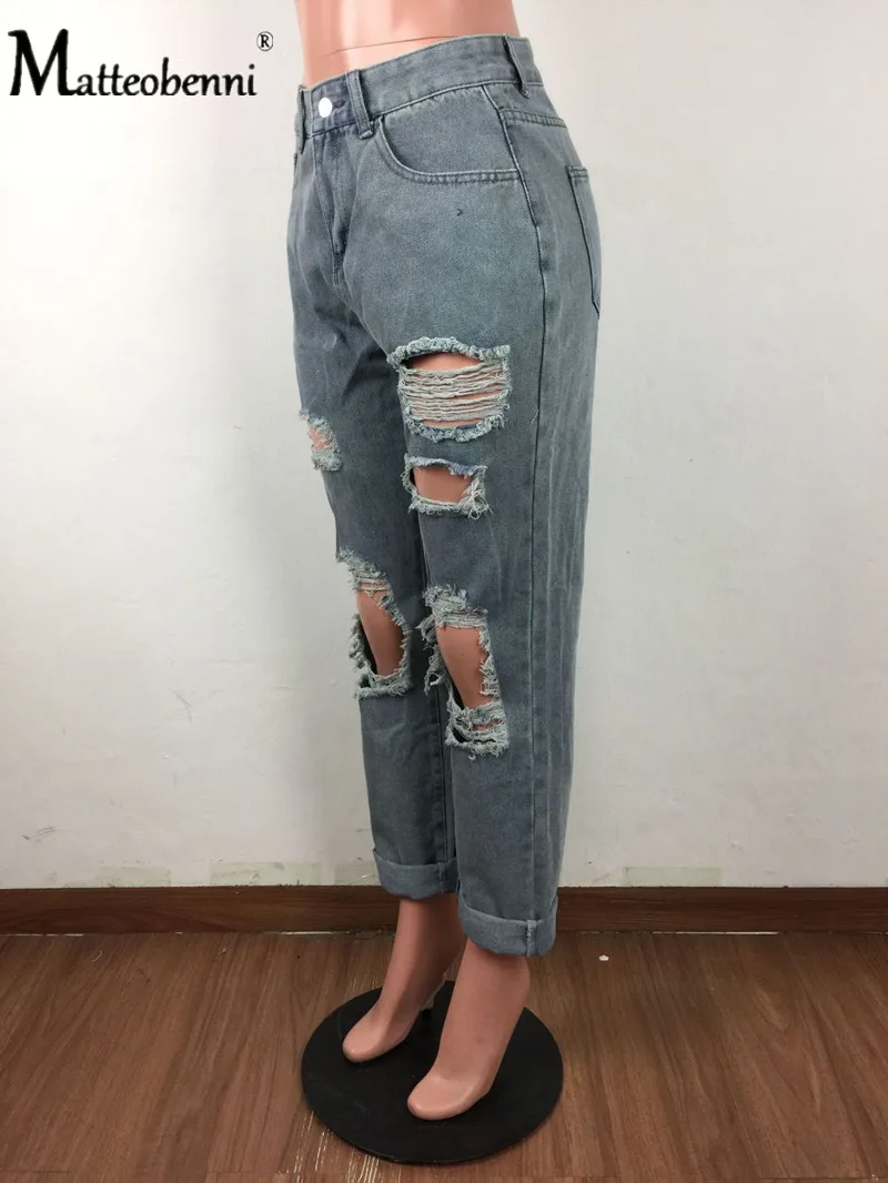 Sexy Knee Big Hole Ripped Distressed Jeans For Women High Waist Boyfriend Jeans Destroyed Denim Jeans Woman Broken Denim Pants