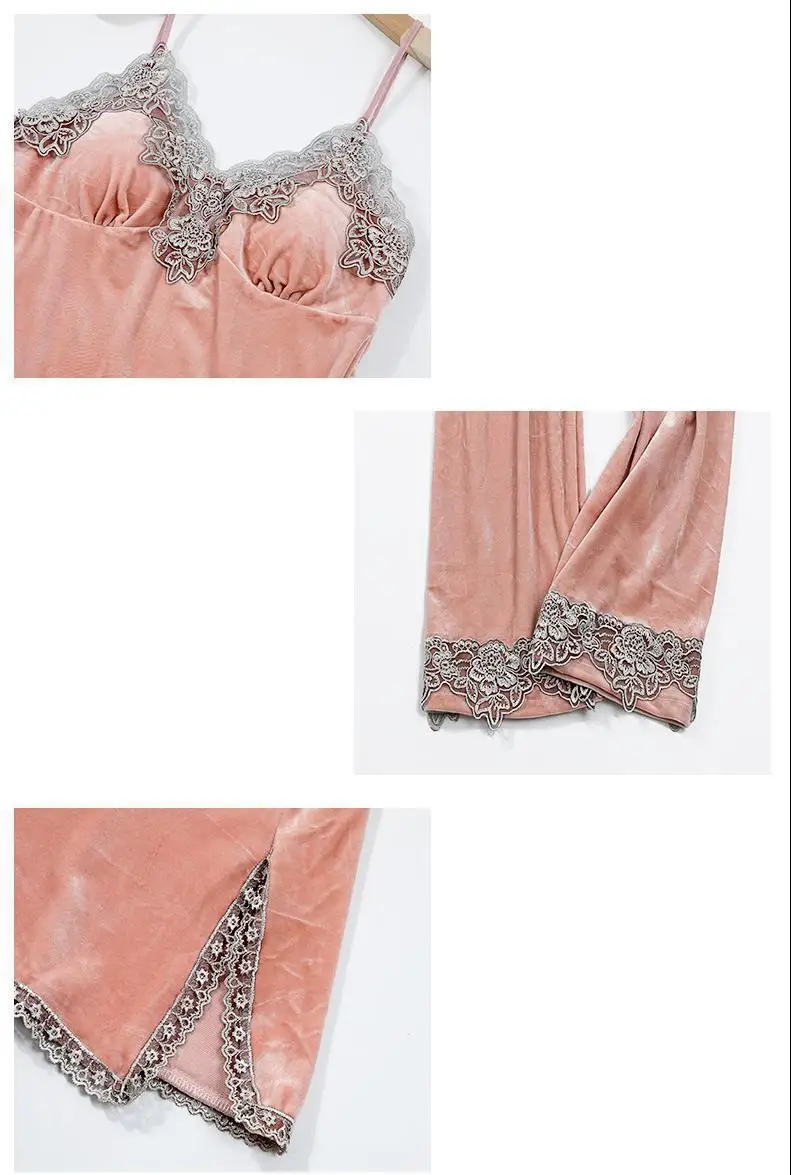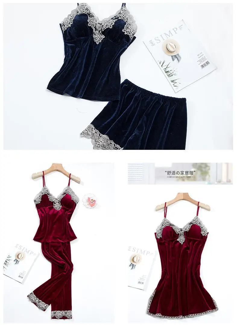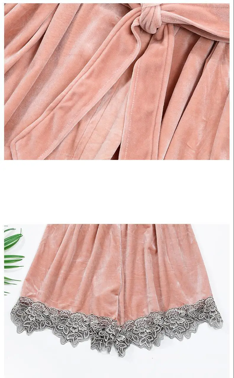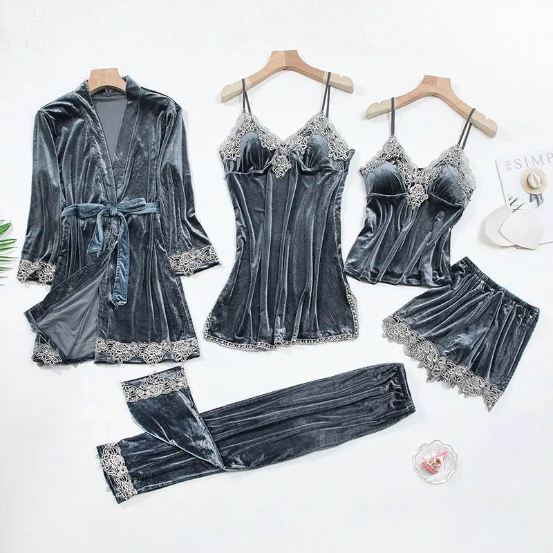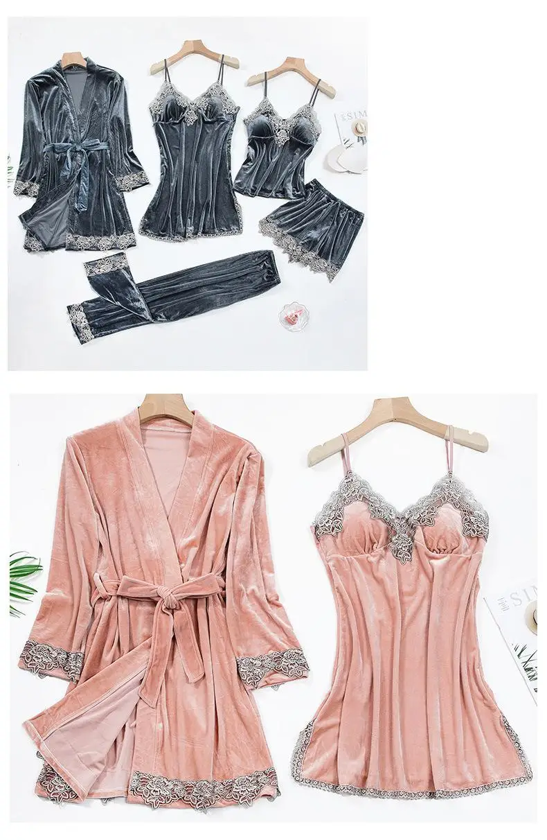 Sexy Lace Nightwear Pajamas Suit Intimate Lingerie Women Velour Sleep Set 5PCS Kimono Robe Velvet Soft Homewear Sleepwear