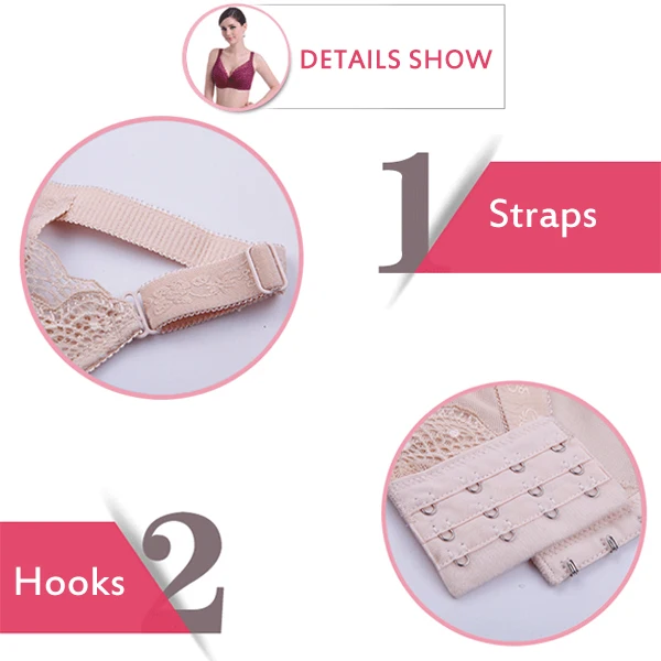 Description: Material: Polyamides Lining Material: Cotton Support Type: Underwire Cup Shape: Full Cup Cup Thickness:Thin Strap Type: Fixed Strap, Adjustable Strap Closure Type: 3X4Hook-and-eye Bust Built-in: 0.1CM Padding Feature: Push Up, Busty, Lace Color:Black, Nude, Purple, Wine Red, Cameo, Blue Size Charts: NOTE: We take US/UK size as standard. The…