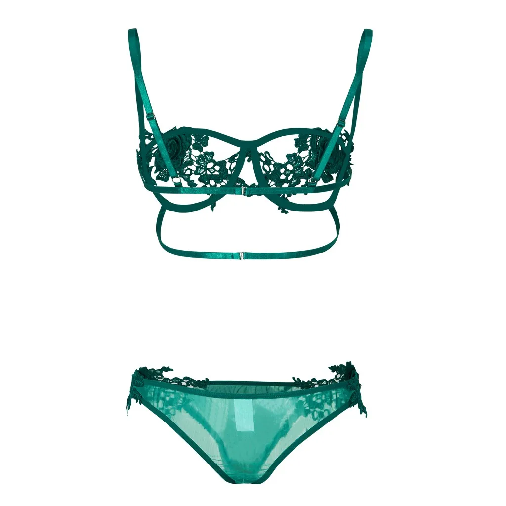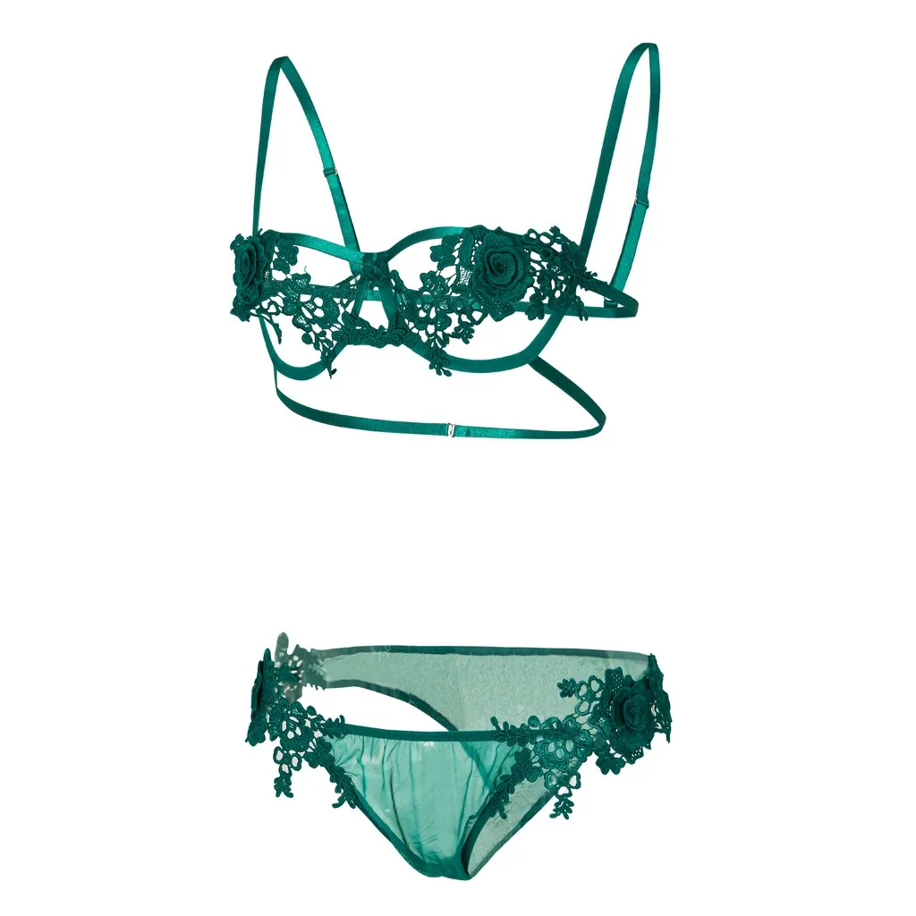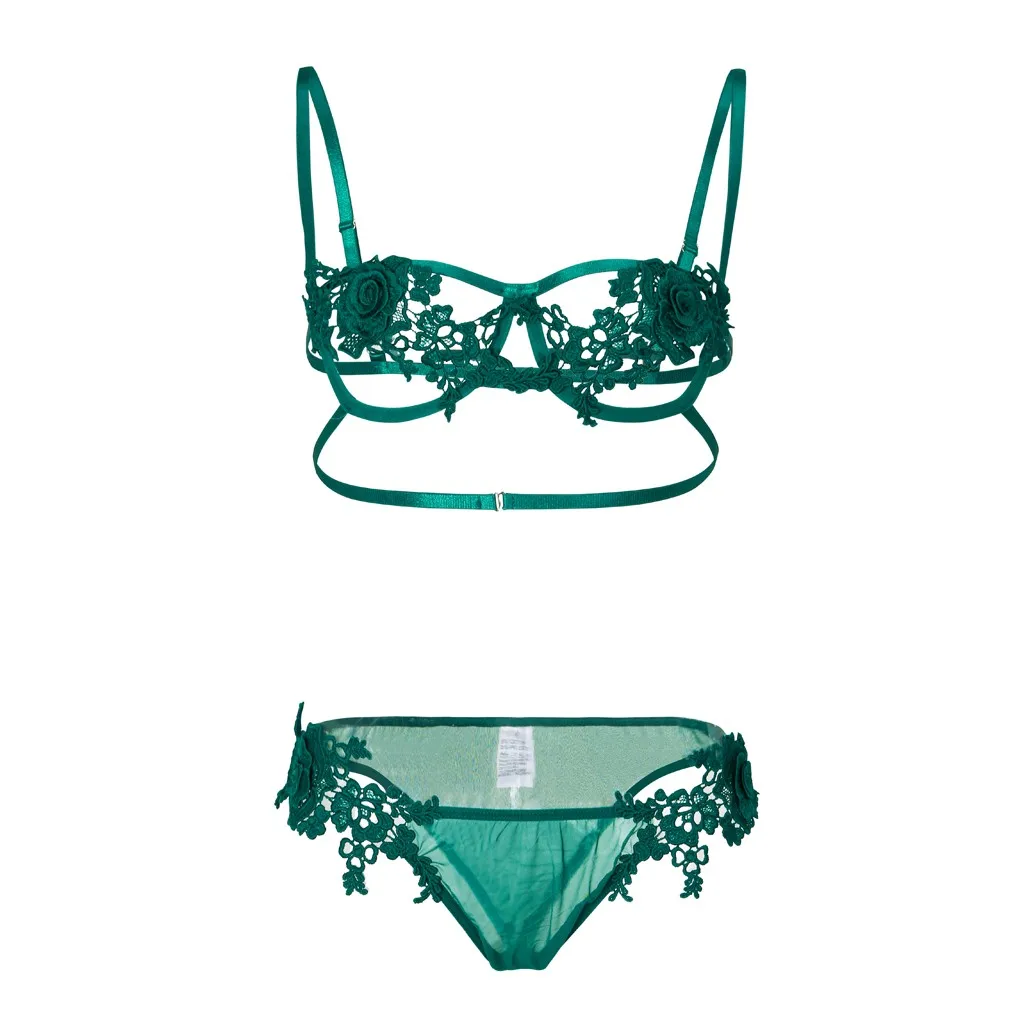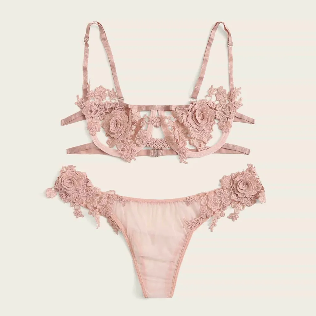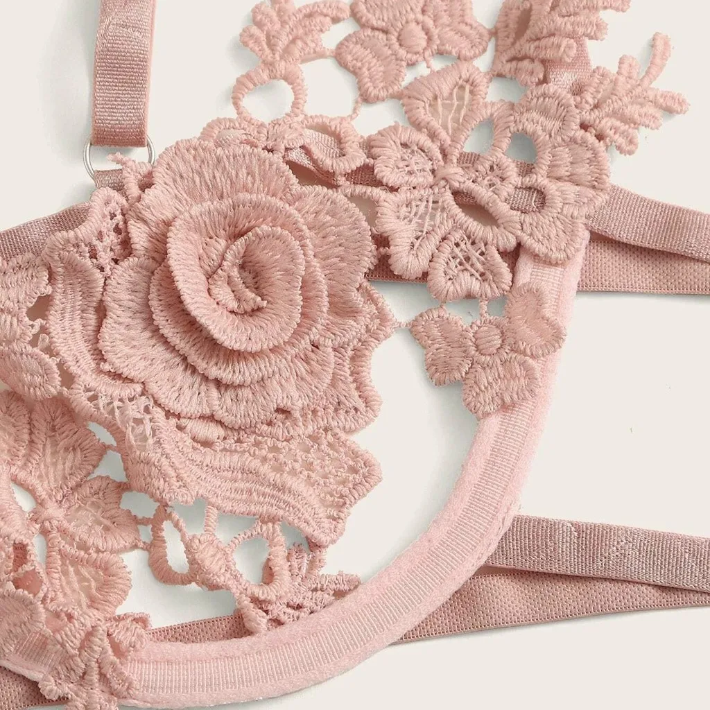 Sexy Lingerie Lace 2Pcs Bra Set Bralette Bralet Bras G-String Panties Temptation Rose Underwear With Steel Ring G-string Thong