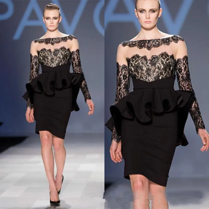 Sexy Little Black Short Party Dresses Lace Knee Length Satin Peplum Long Sleeves 2020 Celebrity prom cocktail dress wear
