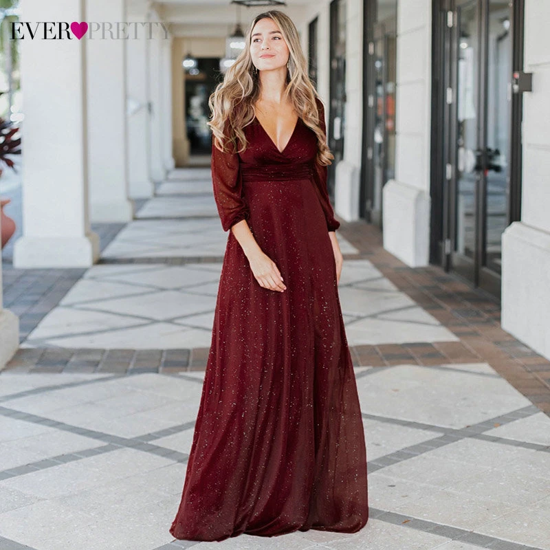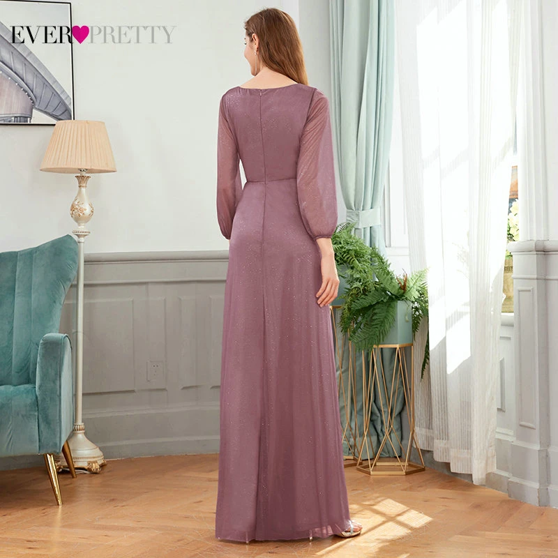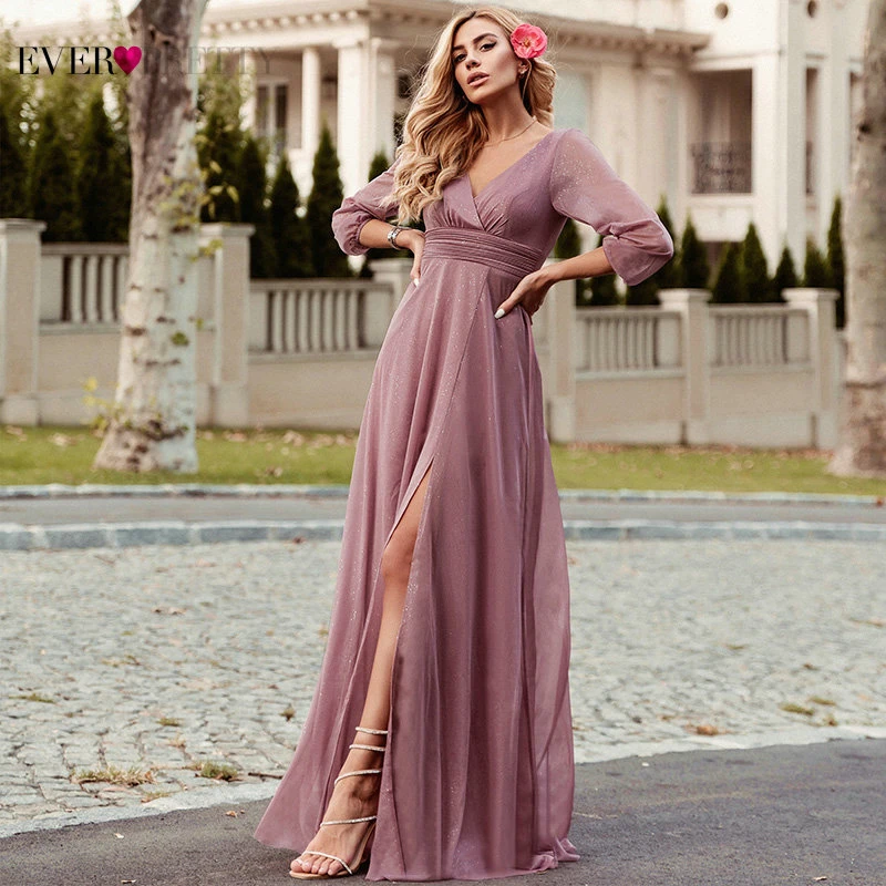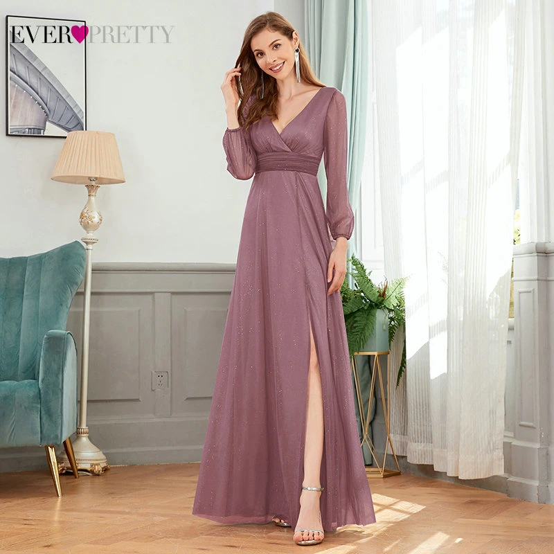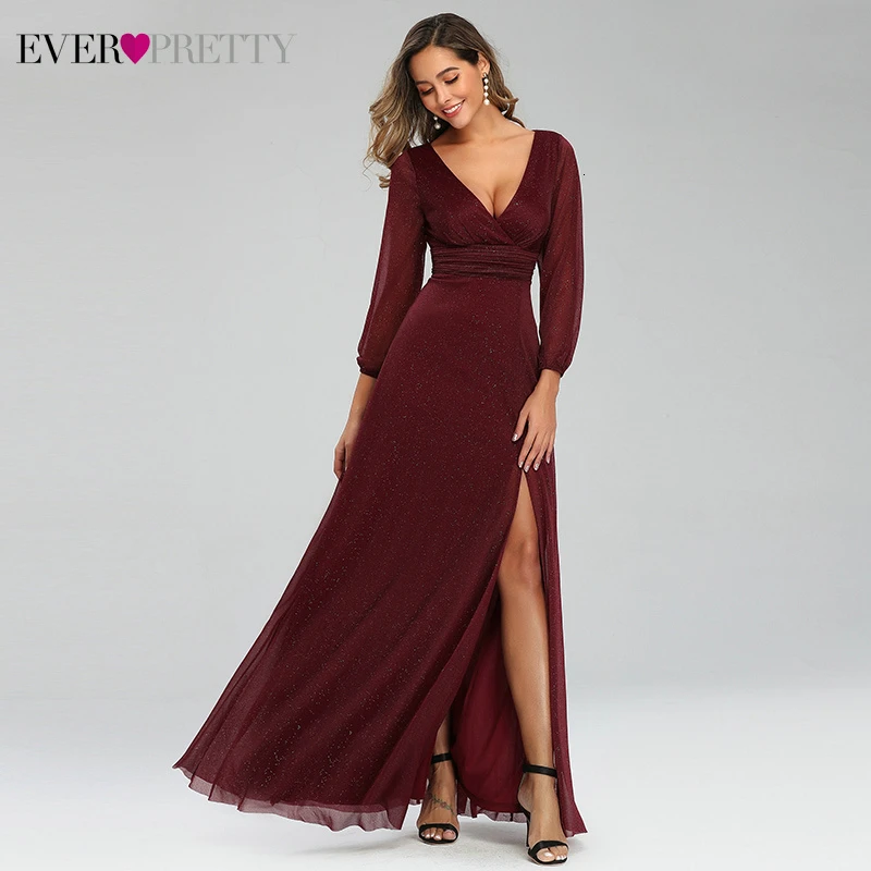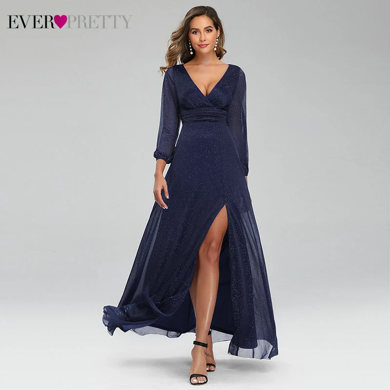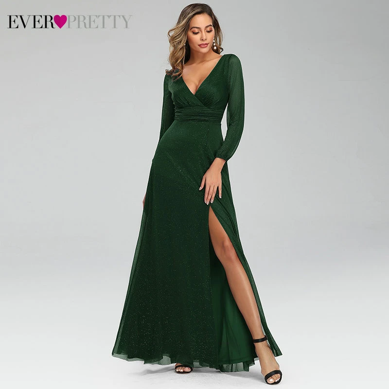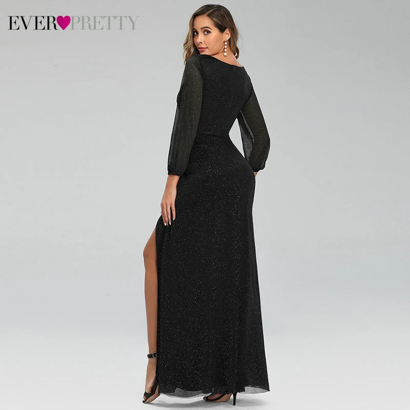 Sexy Side Split Evening Dresses Ever Pretty EP00739BD A-Line Ruhced V-Neck Long Sleeve Sparkle Formal Gowns Sukienki Damskie