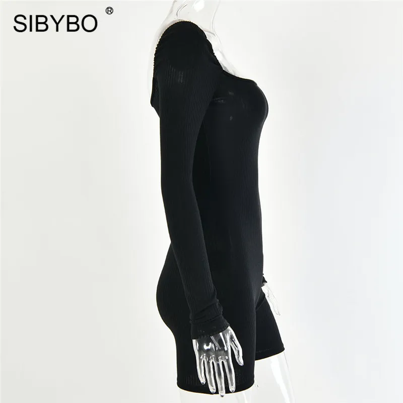 Tittle:SIBYBO Ribbed Square Collar Sexy Rompers Womens Jumpsuit Long Sleeve Skinny Summer Playsuits Women Black Casual Short Jumpsuit