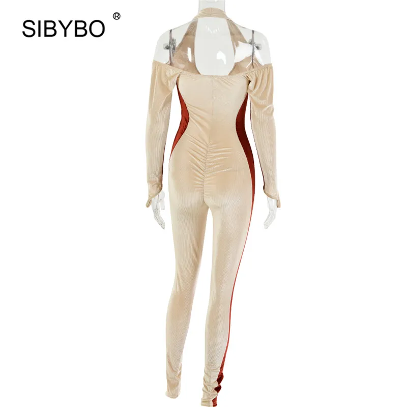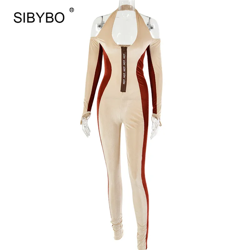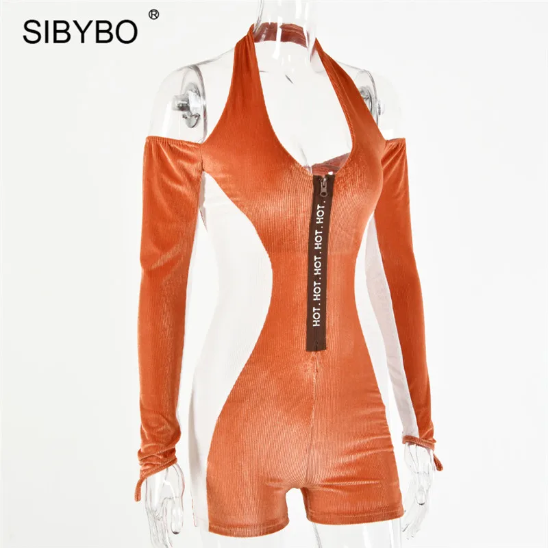 Tittle:SIBYBO Velvet Halter Backless Sexy Womens Romper Jumpsuits Autumn Patchwork Bodycon Playsuits Hot Zipper Sporty Fitness Overalls