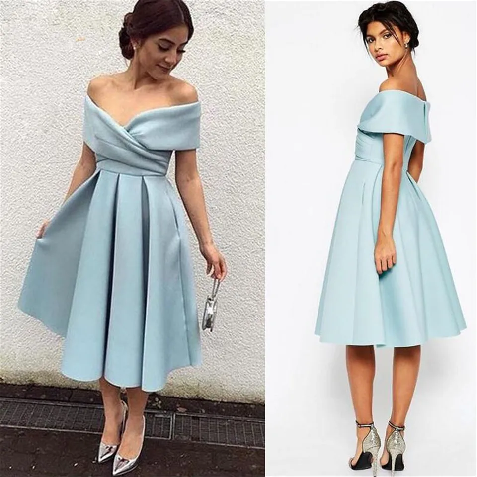 Simple Blue Cocktail Dresses 2020 Short Prom Dresses Vestidos De Gala Off The Shoulder Women Green Graduation Gowns with Pockets