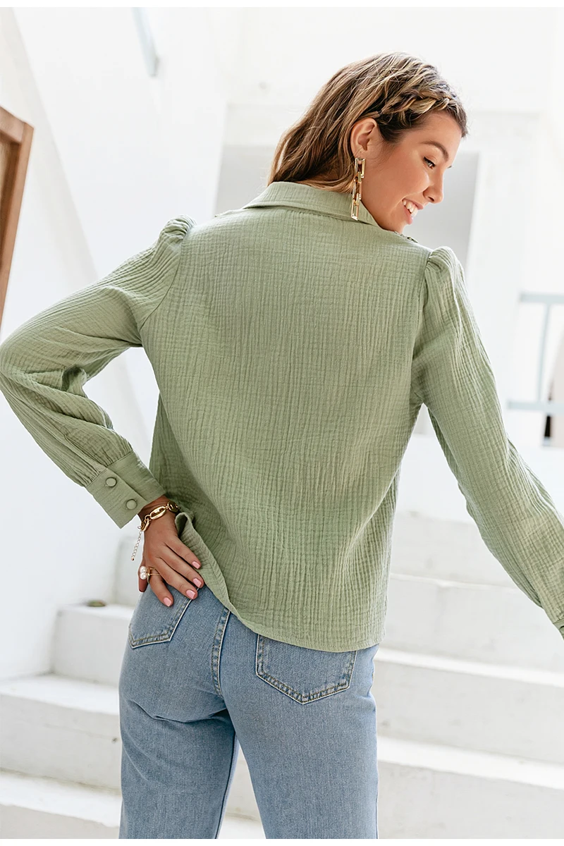 Simplee Cotton Sexy hollow out long sheelve shirt for women Chic spring puff sleeve solid color blouse Casual elegant ladies top