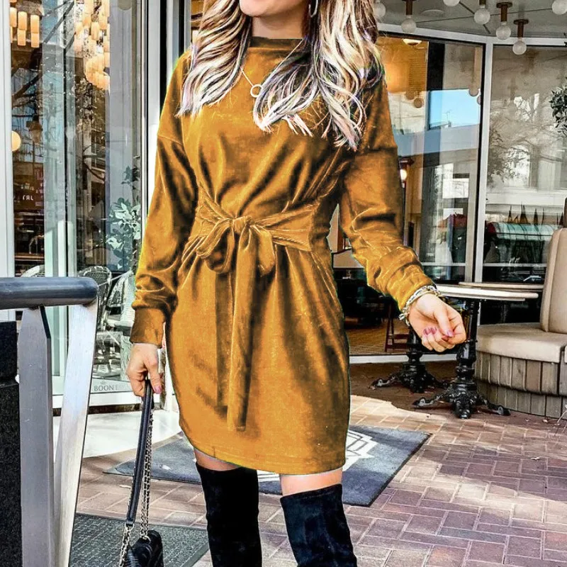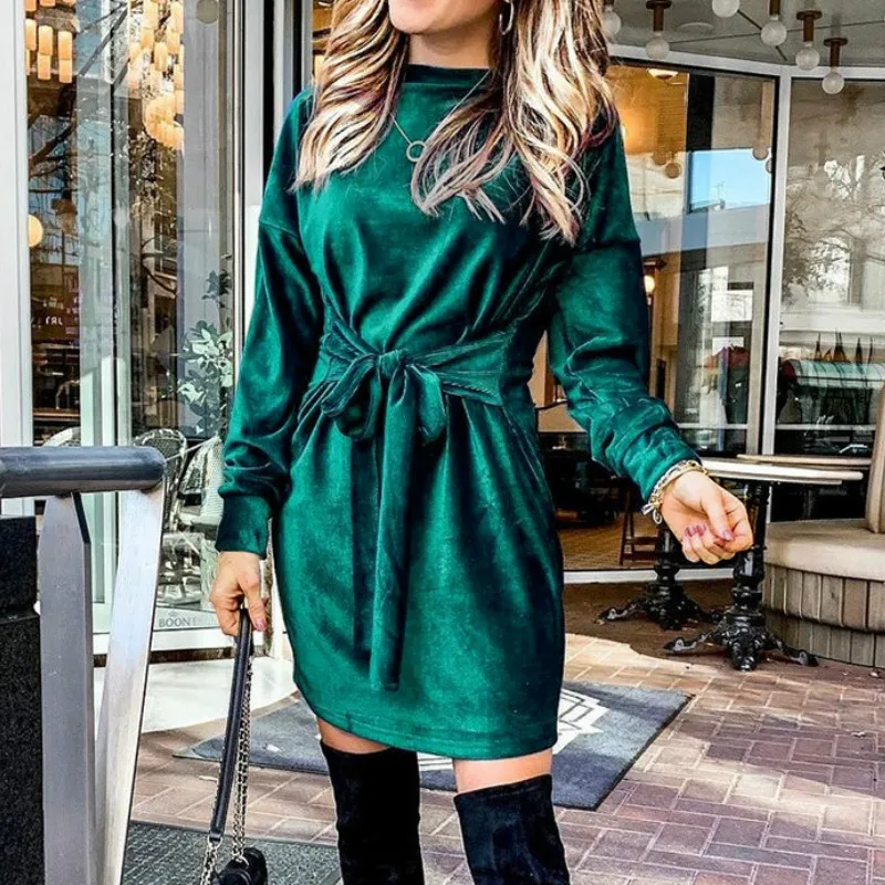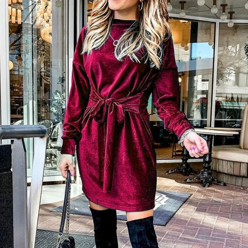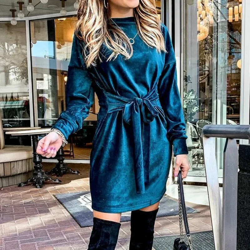 Slim Mini Party Dresses Women Autumn Casual Bodycon For Office Dress Sashes Female Winter Long Puff Sleeve Velvet Dress G2095