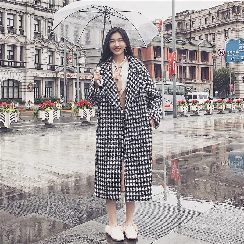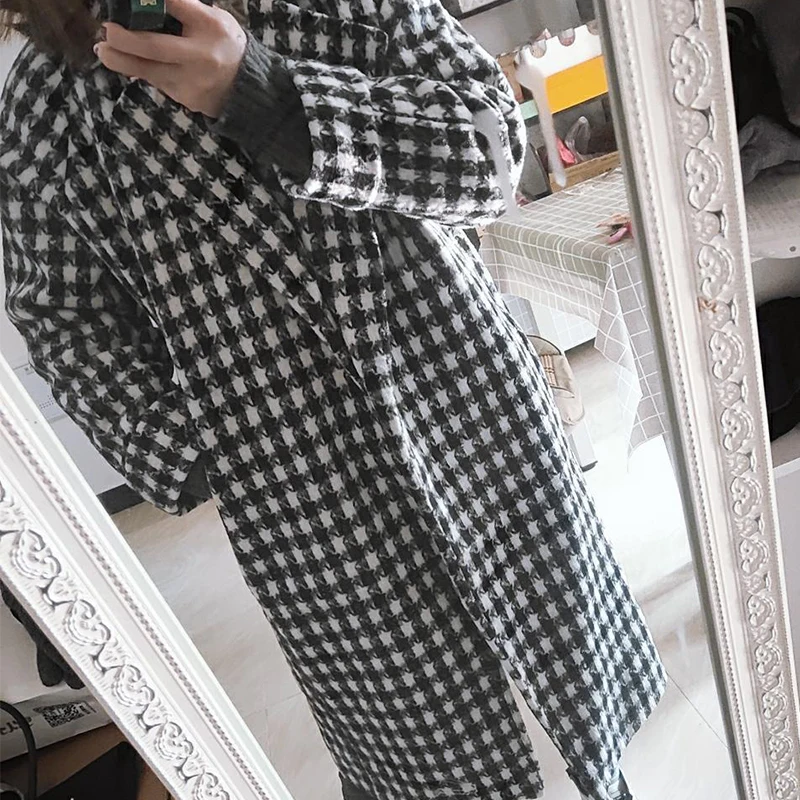 Sllsky Plaid Wool Winter Coat Women Thick Warm Black White Plaid Casual Long Coat Turn-down Collar Loose Soft 2019 New Coat
