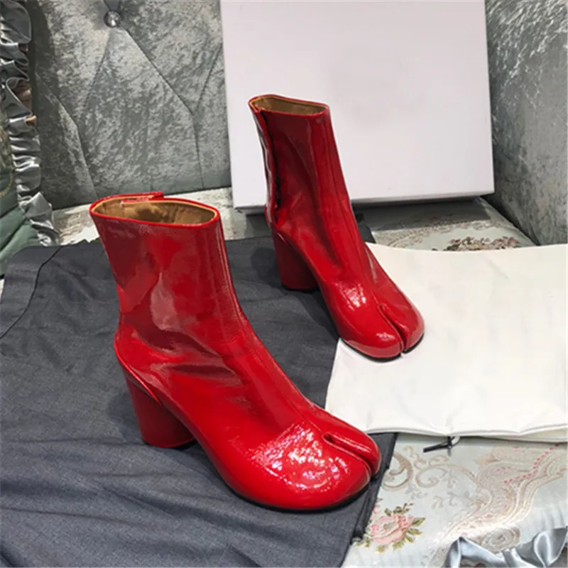 Split Toe Genuine Cow Leather Ankle Boots Women Round Chunky High Heels Short Boots Shoes Ninja Tabi Boots