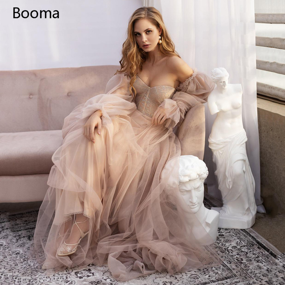 Sweet Dusty Pink Prom Dresses 2020 Off Shoulder Long Sleeves Princess Party Dresses Crumpled Tulle A-Line Formal Evening Gowns