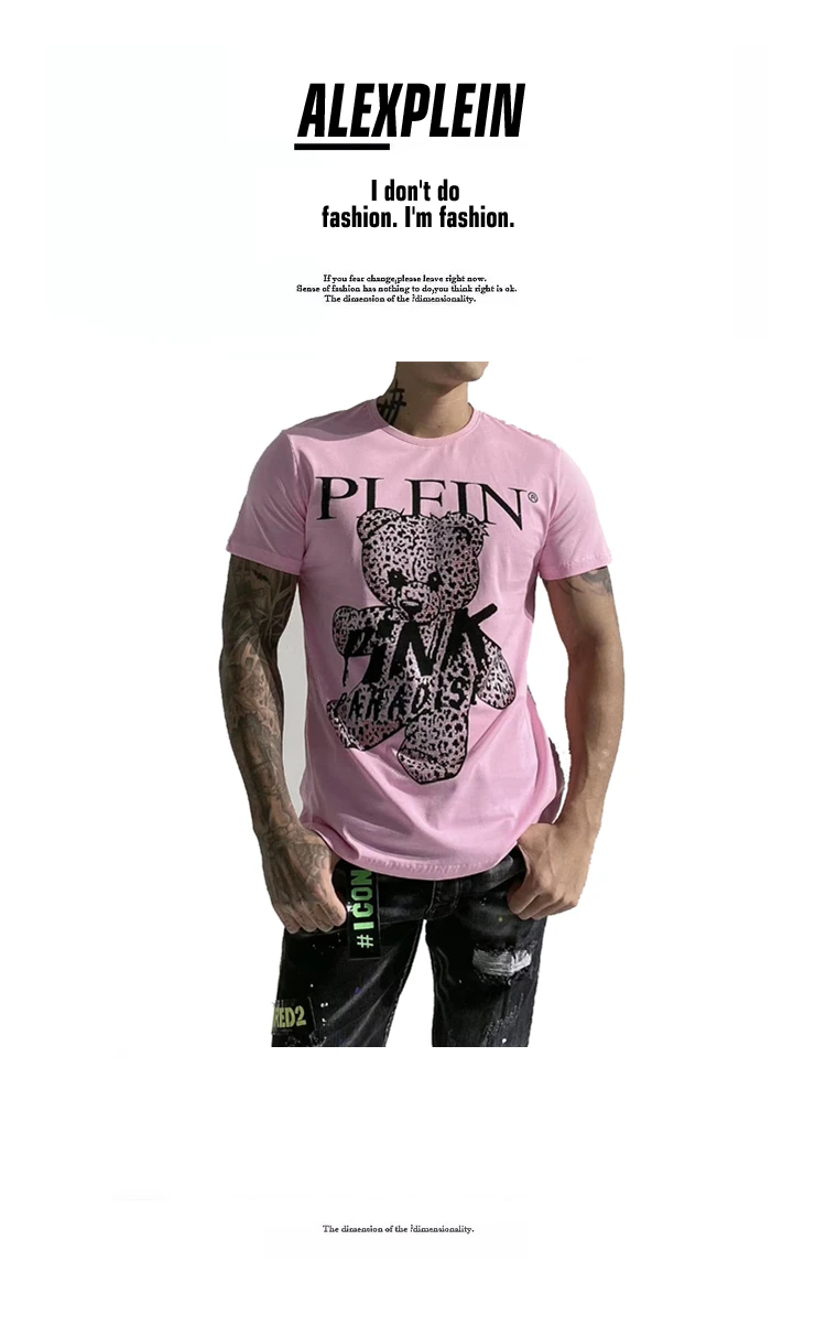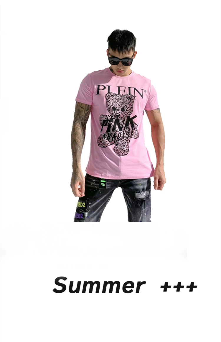 tshirt men cartoon rhinestones teddy bear plein embroidey summer casual wear cotton shortsleeve pink paradise men clothing new