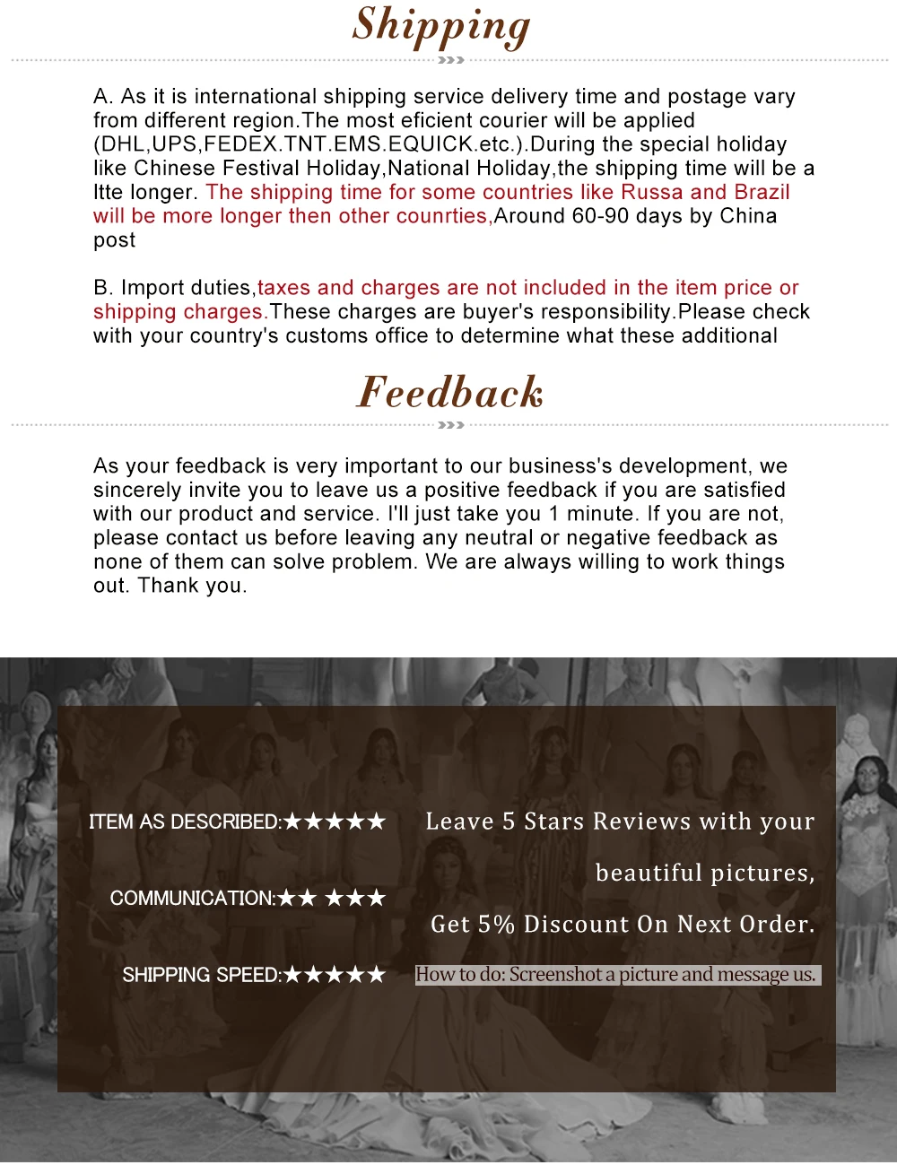 *You can submit refund requests within 15 days after the guaranteed period for delivery (45 days) has expired. You can do it by sending a message on Contact Us page