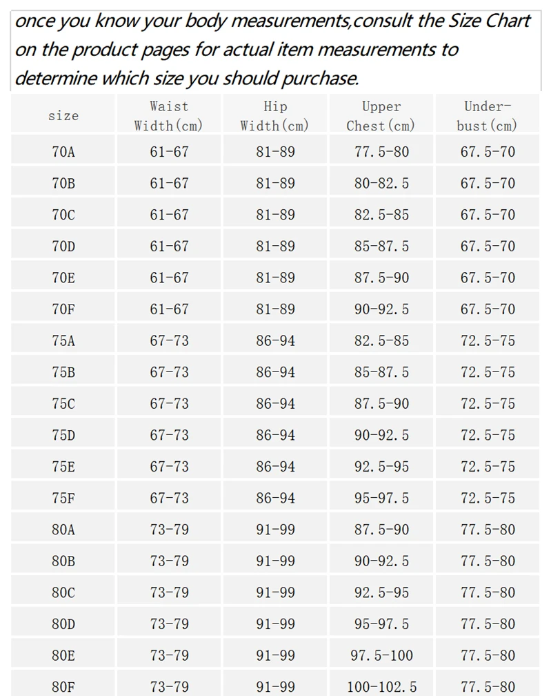 Size Chart Bra Panties/Garter Waist hips S:70ABCD/32ABCD S 61-67cm 81-89cm M:75ABCD/34ABCD M 67-73cm 86-94cm L: 80BCD/36BCD L 73-79cm 91-99cm XL: 85BCD/38BCD XL 79-85cm 96-104cm XXL:90CD/40CD XXL 85-91cm 101-109cm XXL:95CD/42CD XXL 85-91cm 101-109cm NOTE If you need different size panties or garter, just mark in the your order. we will send you the panties you need.thank you! Size Chart About the panties size: 32ABCD bra For the S size panties (70ABCD), For hips…